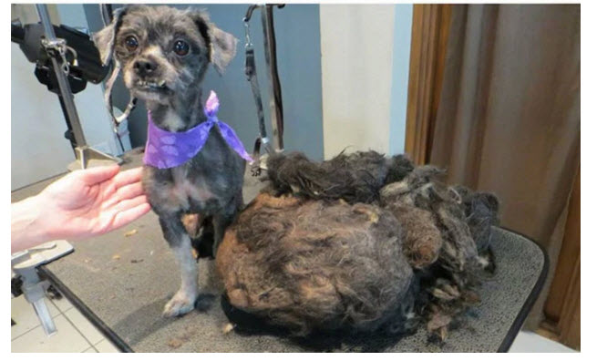 Þessi ljúfi voffi fékk nafnið Shrek – og var erfitt að sjá hverrar tegundar hann var. Þegar hann var tekinn í hundaskýli, hreinsaður og rakaður mátti sjá 6 ára maltese sem hafði einu sinni verið í „puppy mill“ eða hundaverksmiðju.