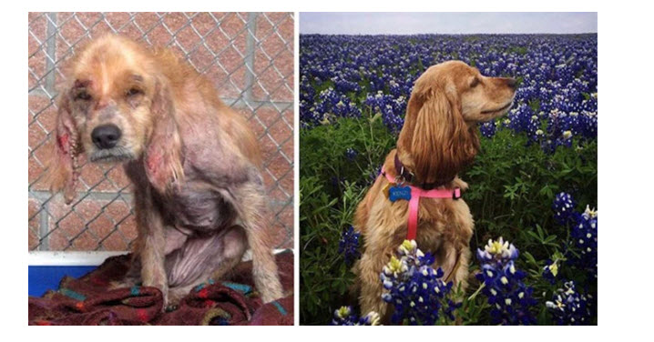 Þessi hræddi og horaði hvolpur heitir Kenzi. Honum var bjargað af Cocker Spaniel Rescue í Austin og San Antonio í Bandaríkjunum og hefur hann nú fengið aftur sinn fyrri styrk og er orðinn heilbrigður. Hann lítur allavega út fyrir að vera afar hamingjusamur!