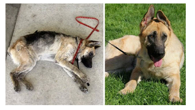 Þessi dásamlegi voffi fannst í ruslatunnu. Hún fékk viðeigandi læknismeðferð og skjól. Seinni myndin er tekin aðeins þremur mánuðum eftir að henni var bjargað. Lífsbjörg góðs fólks.