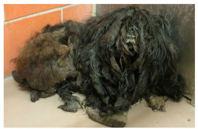 Elsku vinurinn hraktist um heimilislaus í Montreal, Kanada áður en starfsfólk neyðarskýlis fyrir hunda fann hann. Hafði hann sennilega haldið sér hita með þessum furðulega feldi í köldu vetrarveðri.