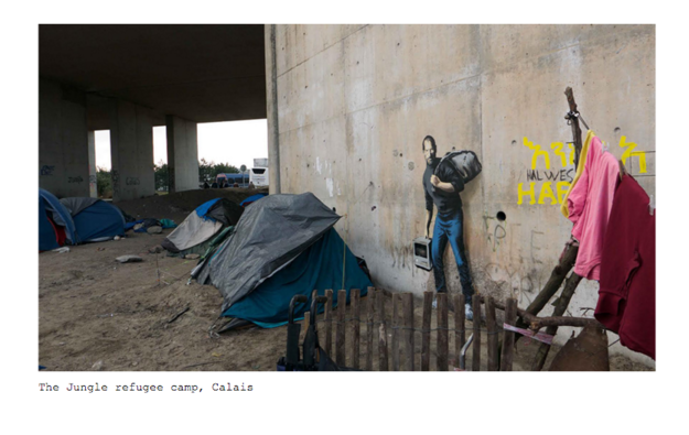 Flóttamannabúðirnar í Calais hafa verið kallaðar „frumskógurinn“ og því vel við hæfi að listaverkið birtist einmitt þar.