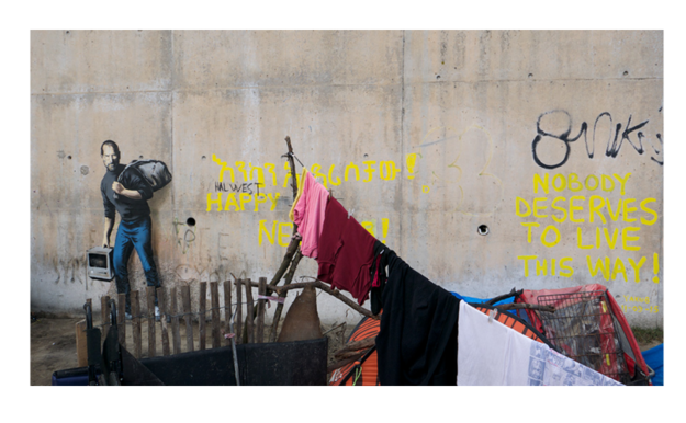 Þetta er ekki í fyrsta sinn sem Banksy lýsir yfir stuðningi við flóttamenn, en Dismaland, listaverk sem birtist í ferðamannabænum Somerset í Englandi gerir það einnig.