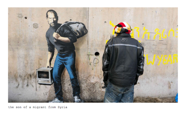 Styður sýrlenska flóttamenn: Apple væri ekki til nema því faðir Steve Jobs flúði Sýrland á sínum tíma. Hinn heimsfrægi og dularfulli listamaður Banksy hefur nú gert nýja mynd í flóttamannabúðum í Calais, Frakklandi og varpar því ljósi á jákvæðu hliðar þess að fá flóttamannastraum til Vesturlanda. Sýnir myndin Steve Jobs með tölvu og svartan poka.