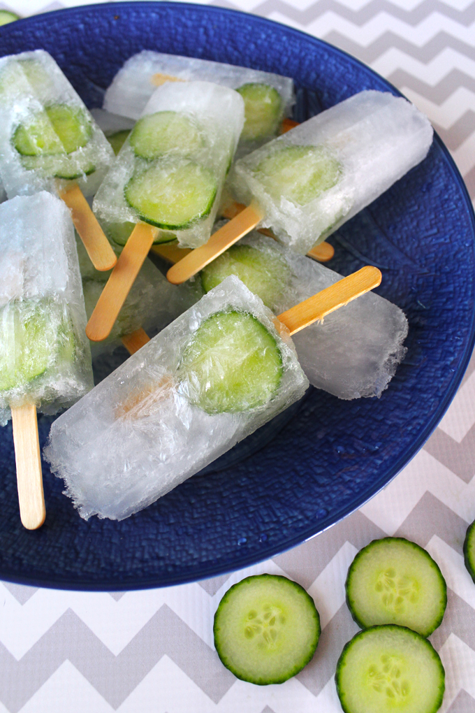 Settu gúrkusneiðar í frostpinnamótin og helltu blöndunni yfir. Láttu vera í frysti yfir nótt.