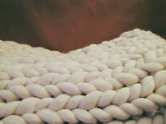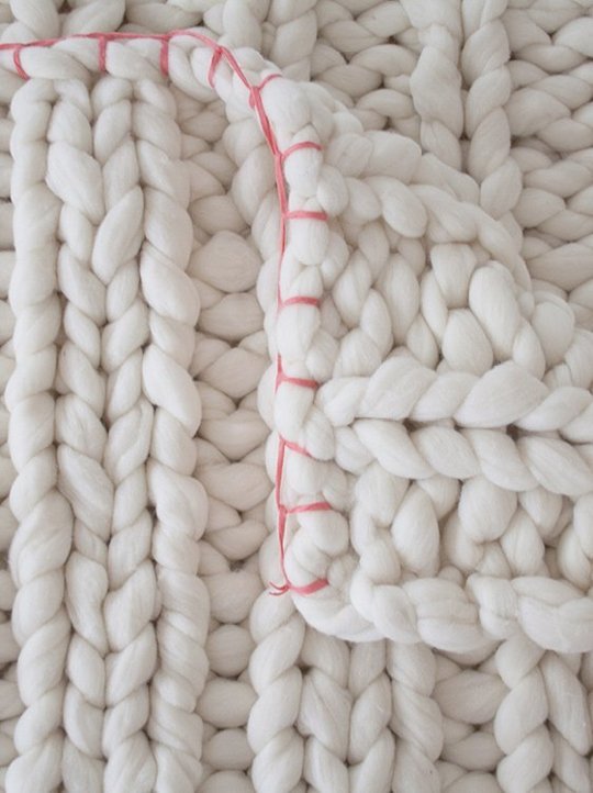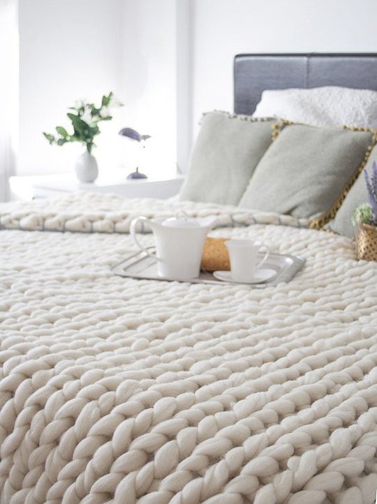 Sælar elskurnar. Frúin er að grúska þessa dagana. Rakst á svo ógurlega fallegt rúmteppi. Handprjónað úr grófu garni með prjónum í yfirstærð. Og teppið er rándýrt! Frúin spurði sig samstundis hvort ekki væri bara hægt að prjóna svona teppi heima. Með hlussuprjóna í höndum og svaðalegt ullarlagð á stofugólfinu.