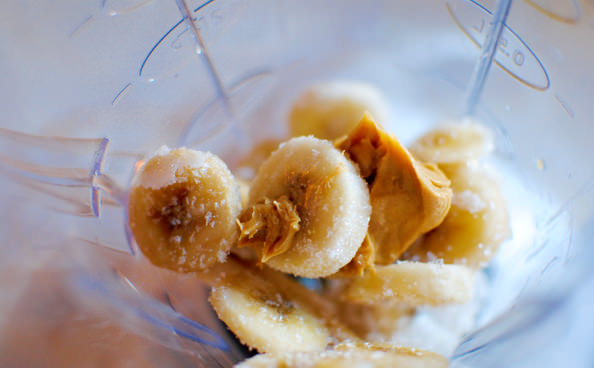 Í þennan drykk þarftu 1 banana (frosinn og afhýddan eða nýjan úr búðinni) og eina matskeið af lífrænu hnetusmjöri i blandarann. Næst stendur valið um 2 dl af möndlumjólk eða 2 dl af AB mjólk – þitt er valið!