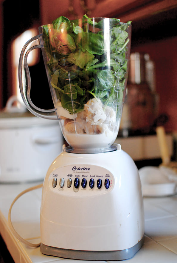 Fylltu að síðustu blandarann upp í topp með spinatlaufum. Áætlaðu bara og fylltu blandarann af iðilgrænum laufum, vertu rausnarleg/ur frekar en hitt. Smelltu blandaranum af stað og hrærðu vel þar til blandann er orðin þétt og mjúk í sér og engar ójöfnur er að finna i blöndunni.