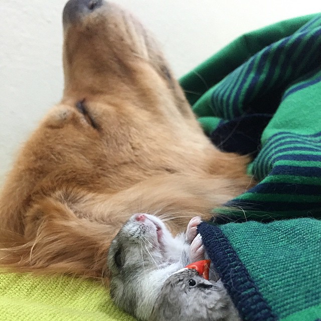 Bob hefur afsannað með öllu þá kenningu að erfitt sé fyrir ólík dýr að lynda við hvort annað, því sönn vinátta þekkir engin landamæri og það er því lánsamur gæludýraeigandi sem smellir reglulega af ljósmyndum af þessum fágæta hópi sem elskar að lúra saman.