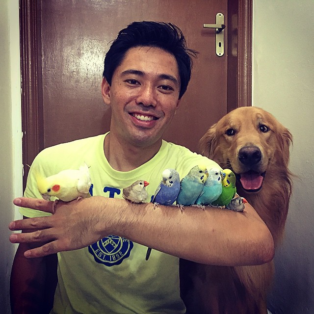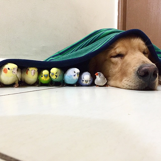 Blíðlyndi risinn Bob er Golden Retriver og býr með sæg af páfagaukum