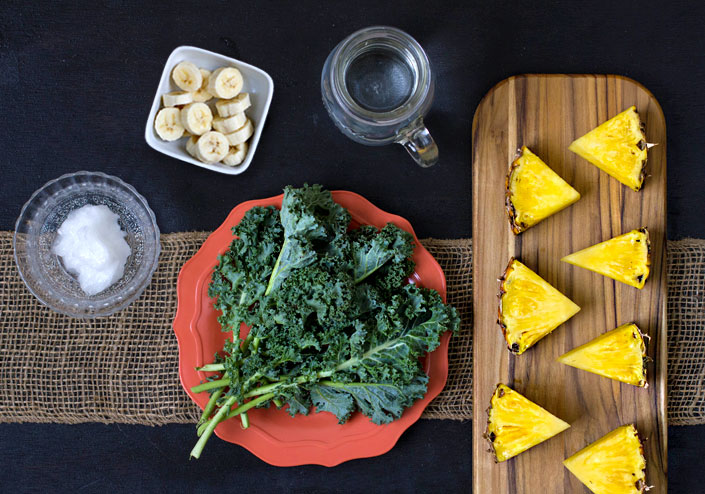 Í þessa uppskrift þarf grænkál, ananas, banana og svo auðvitað kókosolíu sem gefur drykknum heilandi yfirbragð og jafnar blóðsykurinn. Ekki gleyma að þynna drykkinn út með vatni og vertu ófeimin við að setja frosna ávexti í blandarann, þeir kæla, fríska og vekja snemma morguns.