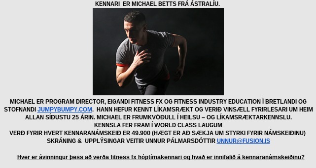 Skemmtilegt er að segja frá því að lokum, að Michael Betts, sem mun leiða kennaranámskeiðið um helgina, er ekki einungis frumkvöðull á sviði fjarkennslu í líkamsrækt; hann heldur einnig úti stórskemmtilegri vefsíðu þar sem hann selur líkamsræktartónlist. Michael er frumkvöðull á sínu sviði og hefur kennt um allan heim síðustu 25 árin.”