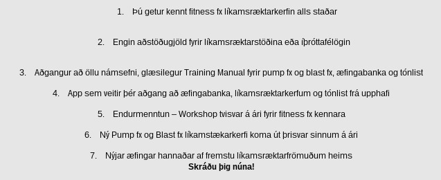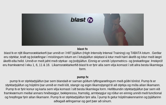 Þetta eru hópkerfi sem verða í boði í World Class og vonandi á fleiri líkamsræktarstöðvum frá og með haustinu, en ég býð upp á kennaranámskeið þar sem þú getur lært líkamsræktarkerfin og hlotið réttindi til að kenna þau. Fitness fx líkamsræktarkerfin eru alls níu talsins en við byrjum á að innleiða tvö kerfi sem heita Blast fx og Pump fx. Erlendur líkamsræktarfrömuður er gagngert kominn hingað til landsins í þeim tilgangi að innleiða, mennta og kenna kerfið hérlendis.”