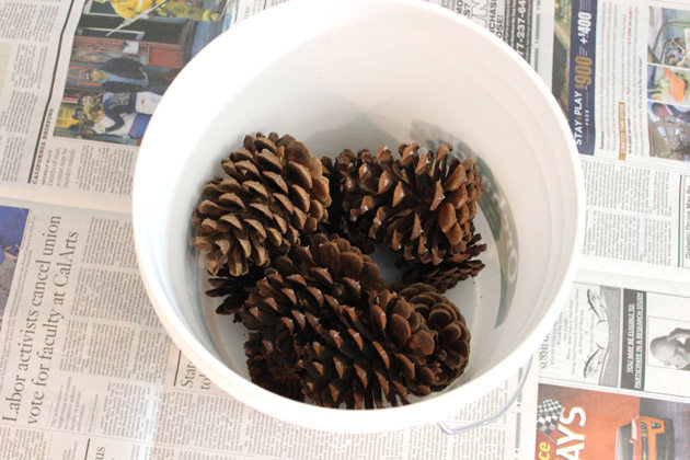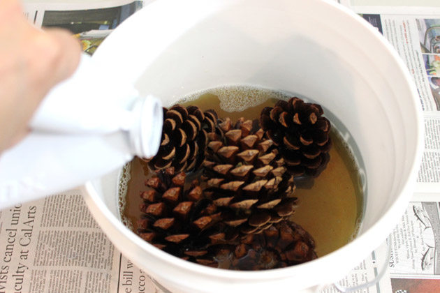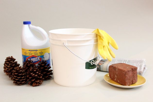 Byrjaðu á því að breiða dagblöð undir fötuna sjálfa, ef vera skyldi að klórinn skvettist upp úr – því ekki viltu fá klórslettur á sjálfan undirflötinn! Dustaðu mestu moldina og óhreinindin af grenikönglunum og hagræddu þeim því næst í plastfötunni. Best er að velja litla plastfötu svo klórinn fljóti yfir grenikönglana þegar blandan er frágengin. Þú getur vel notað klórinn aftur og aftur, þegar þú hefur fjarlægt grenikönglana – þú getur sett fleiri greniköngla ofan í og endurtekið allt ferlið upp á nýtt.