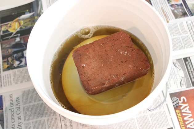 Hér kemur múrsteinninn til sögunnar; könglarnir fljóta nefnilega upp á yfirborðið og ef þú þrýstir þeim ekki undir yfirborðið með múrsteininum, koma þeir mislitir upp úr klórnum. Fyrst skaltu leggja keramikdiskinn ofan á könglana og ofan á diskinn skaltu leggja múrsteininn. Gættu þín á að klæðast gúmmíhönskum, þar sem þú ert að meðhöndla sterk efni og vilt ekki erta hörundið á höndunum.