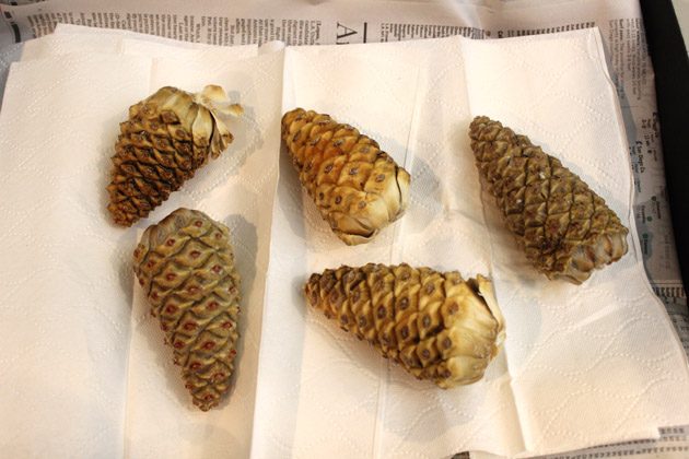 Best er að leggja grenikönglana til þerris utandyra, (jafnvel úti á svölum) þar sem klórlyktin er sterk í byrjun en ferskt útiloftið dregur úr dauninum. Settu einfaldlega dagblöð á þurran og traustan skjóstað utandyra, leggðu könglana ofan á dagblöðin og leyfðu þeim að þurrka sig náttúrulega. Könglarnir opna sig aftur þegar þeir þorna.