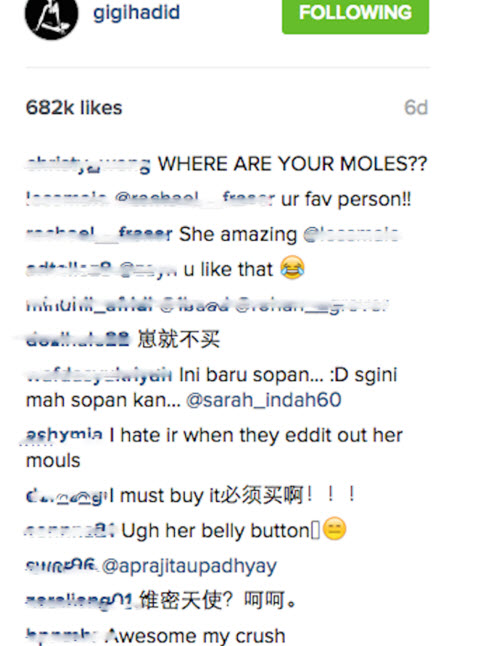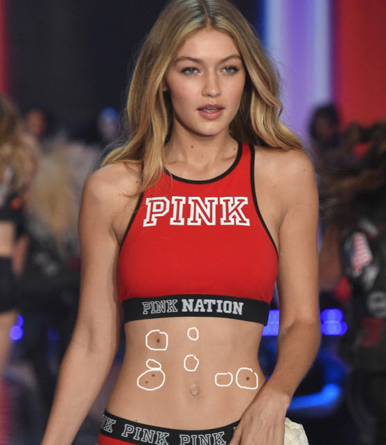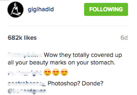 Þetta er þó ekki í fyrsta skipti sem myndvinnsluforrit hefur verið notað til að breyta útliti Gigi. Glöggir sjá hér að það vantar á hana tánögl….