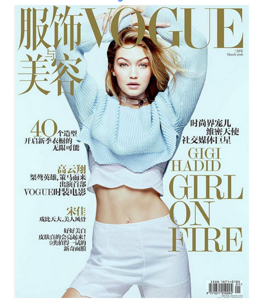 Myndvinnsluklúður: Aðdáendur súpermódelsins Gigi Hadid urðu fokreiðir þegar þeir sáu ofur- fótósjoppaða mynd af Gigi á forsíðu kínverska Vogue. Sérð þú hvað vantar?