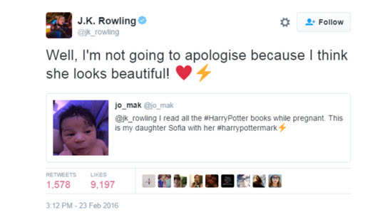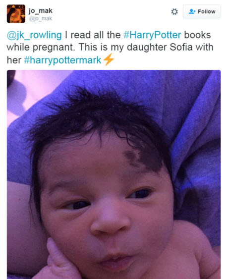 Rithöfundurinn J. K. Rowling óskaði mömmunni til hamingju á Twitter þar sem mamman deildi myndinni til hennar. Hin nýfædda Sophie fæddist með fæðingarblett sem líkist þeim sem persóna Harry Potter er með í bókunum frægu.