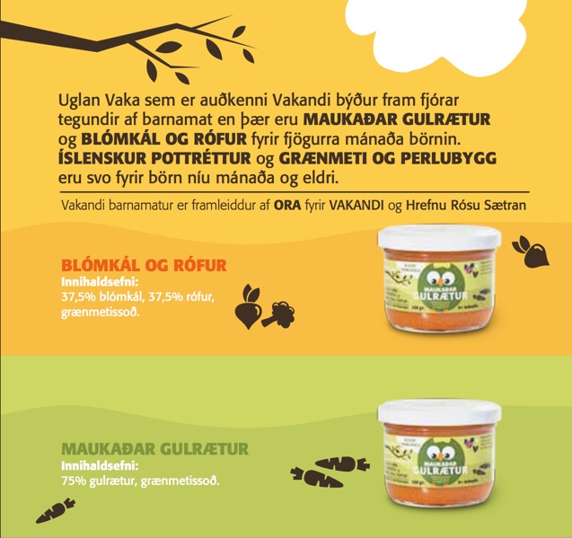Uglan Vaka er auðkenni Vakandi og býður fram fjórar tegundir af barnamat en þær eru: MAUKAÐAR GULRÆTUR og BLÓMKÁL OG RÓFUR fyrir fjögurra mánaða börnin. ÍSLENSKUR POTTRÉTTUR og GRÆNMETI OG PERLUBYGG eru svo fyrir börn sem eru níu mánaða og eldri.