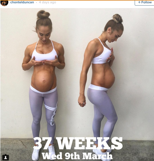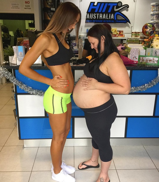 Konan á vinstri hönd er Chontel Duncan – fitnessmódel og fyrrverandi Miss Universe keppandi frá Ástralíu. Hún er gengin 21 viku á leið á þessari mynd en hún á að eiga í lok marsmánaðar. Á hægri hönd er vinkona hennar, Natalie Smith sem átti að eiga í byrjun mars.