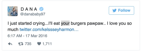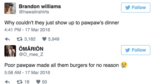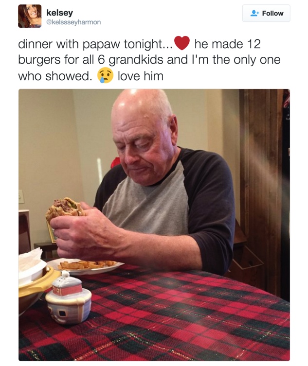 Sem myndi útleggjast á íslensku að hún borðaði kvöldmat með honum og hann hafði búið til 12 hamborgara fyrir öll sex barnabörnin en hún var sú eina sem mætti. Papaw hafði meira að segja búið til heimagerðan ís, sem var uppáhald allra barnanna þegar þau voru lítil.
