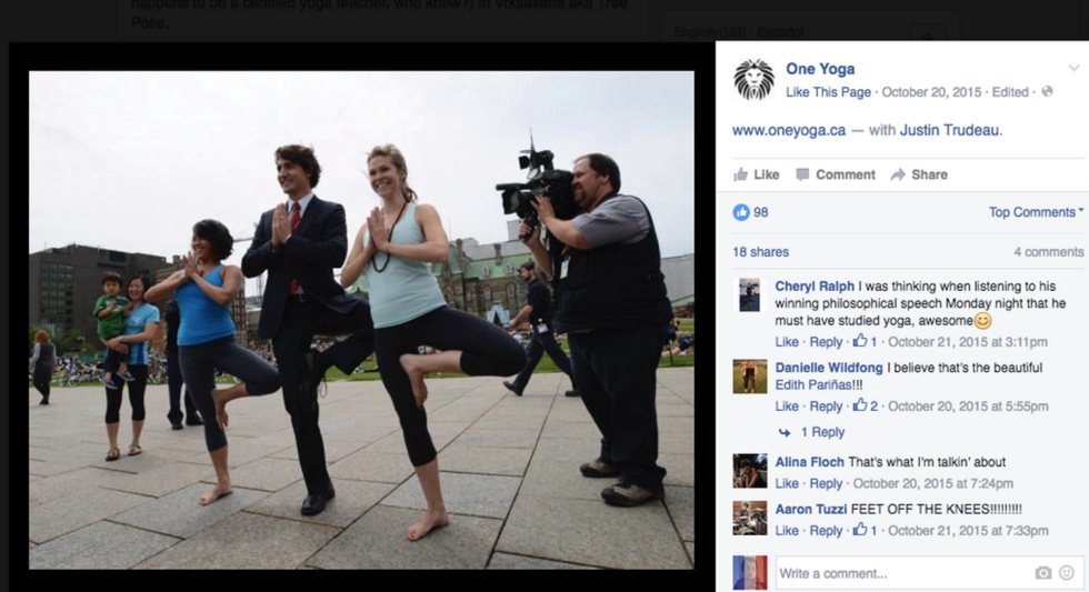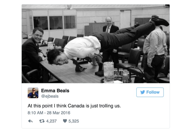 Justin Trudeau, sennilega vinsælasti forsætisráðherra í hinum vestræna heimi, sýnir hér styrk sinn en hann heldur sér á höndunum á skrifborði. Justin er mikill aðdáandi jóga og kallast þessi pósa „peacock“ (páfuglinn) eða mayurasana. Hlýtur þetta að krefjast mikillar einbeitningar því forsætisráðherrann er tæpir tveir metrar á hæð!