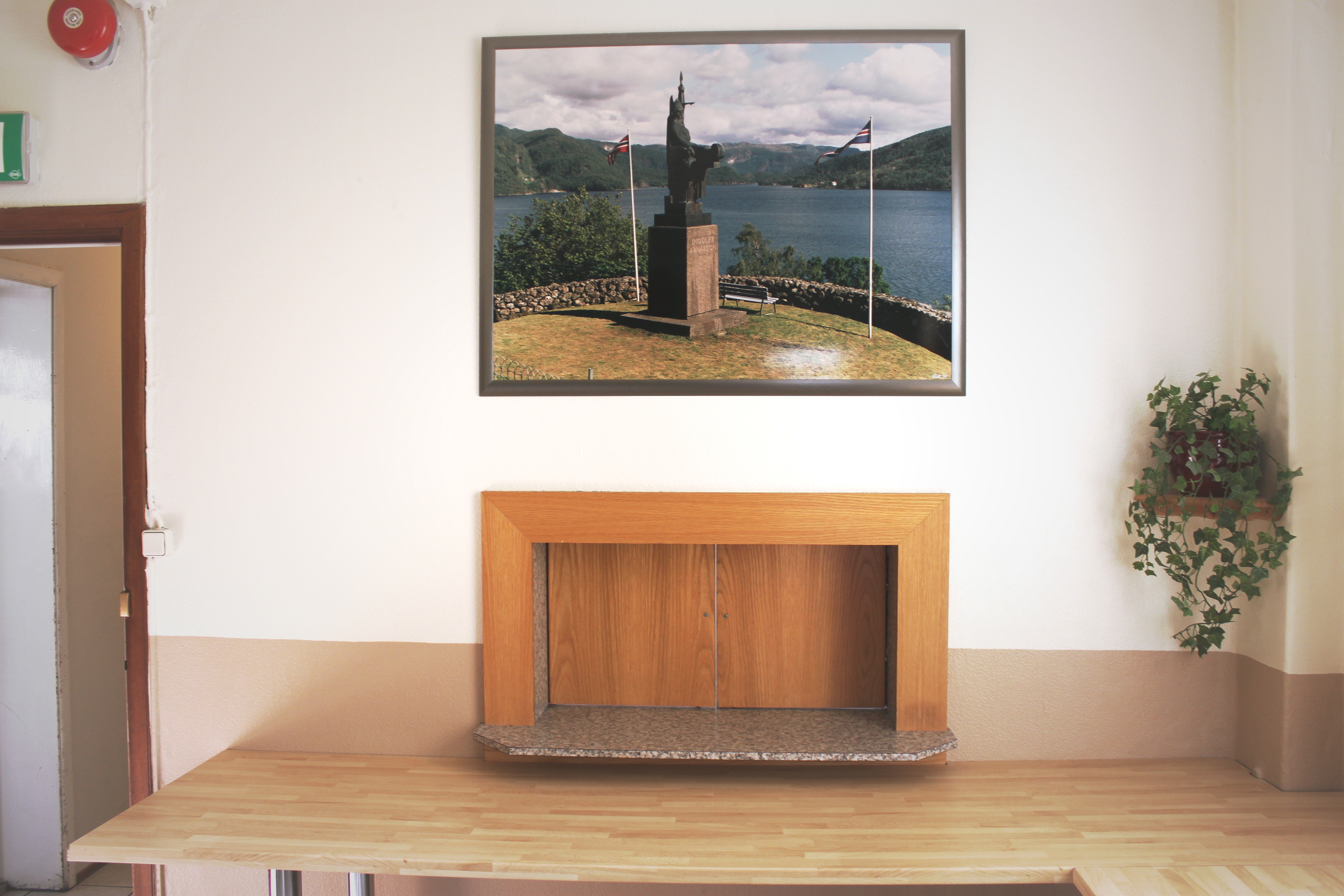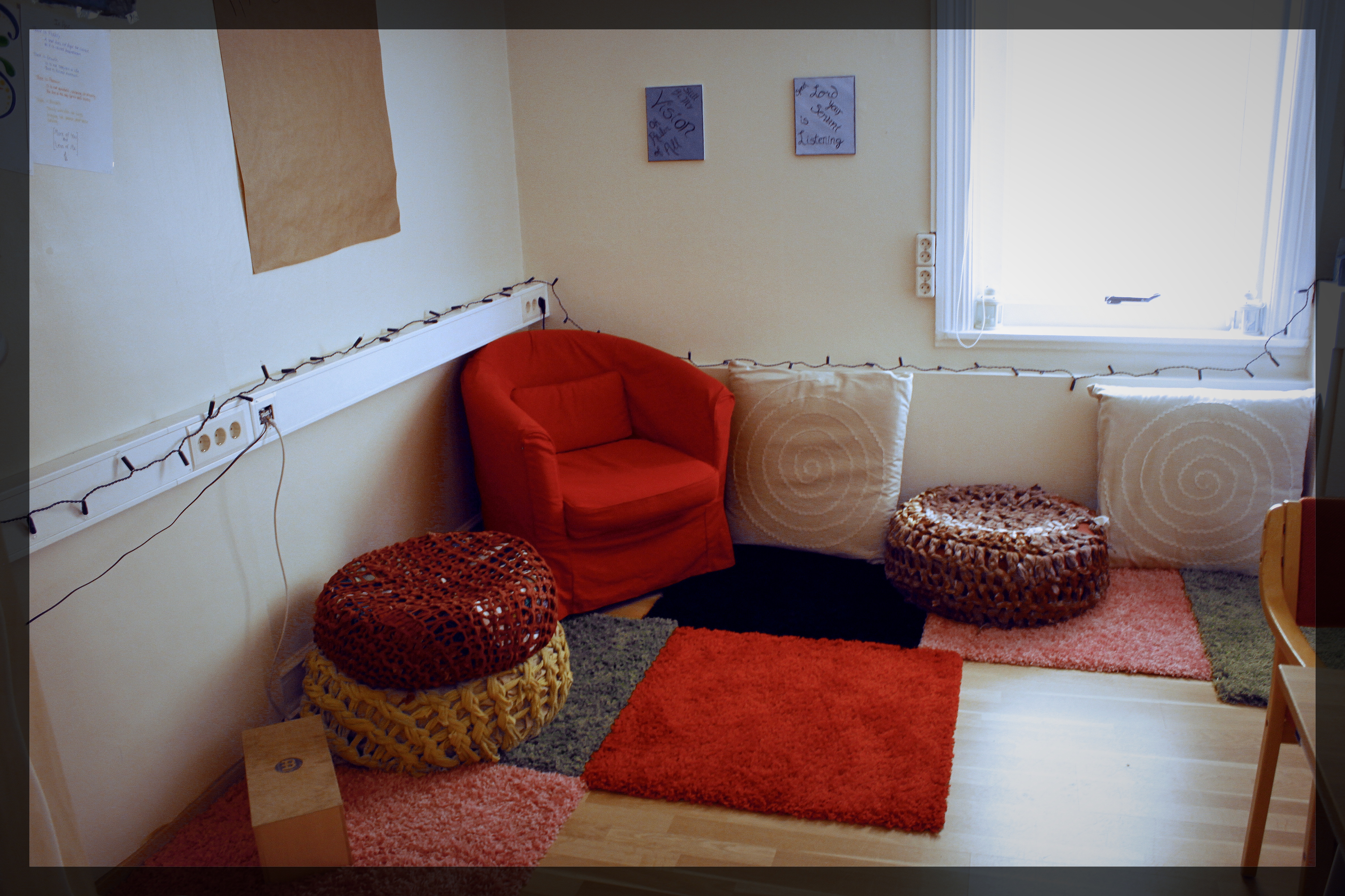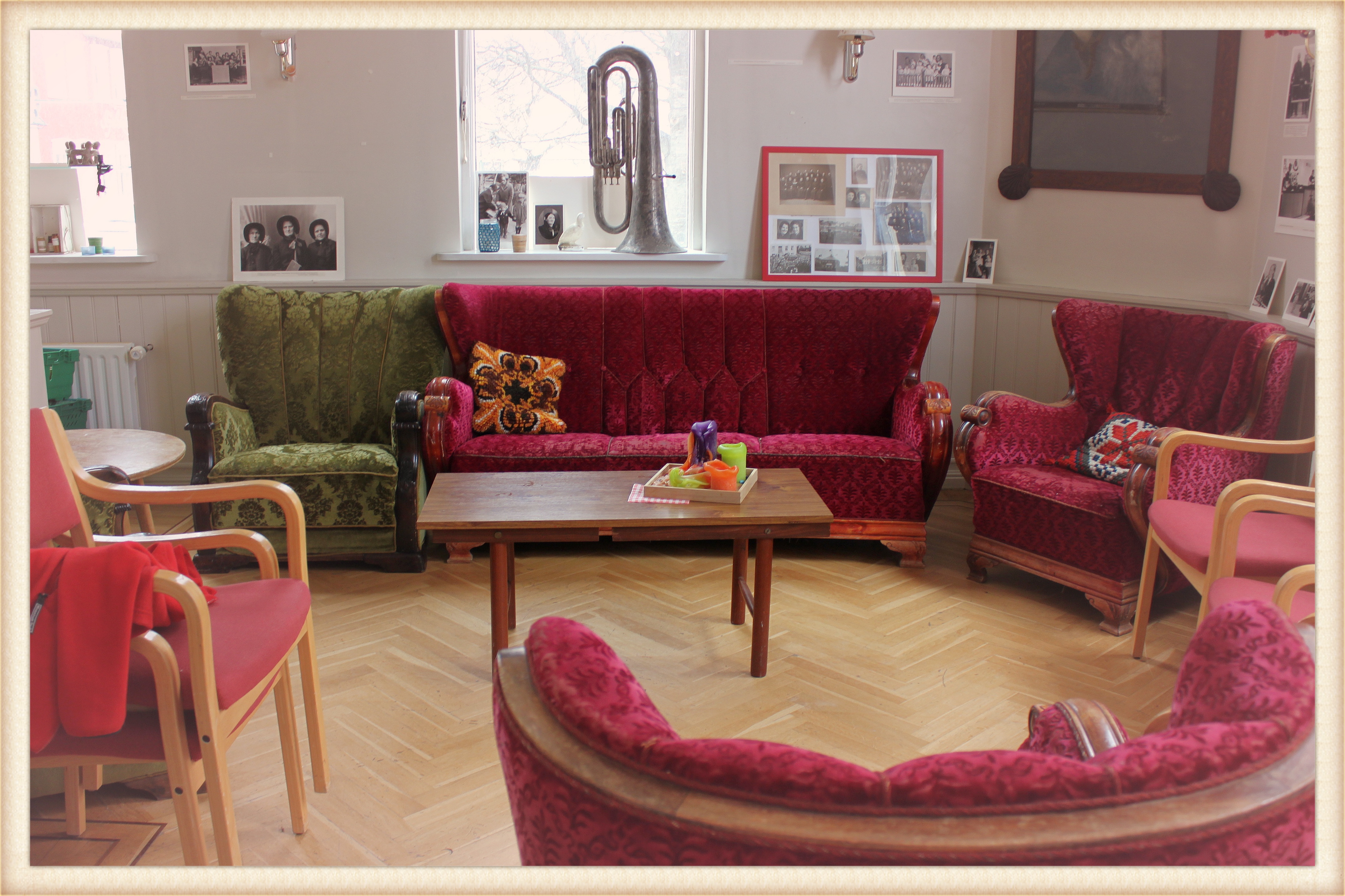 Lítil setustofa inn af kirkjunni. Í glugganum er gamall lúður sem hefur tilheyrt Hjálpræðishernum lengi.