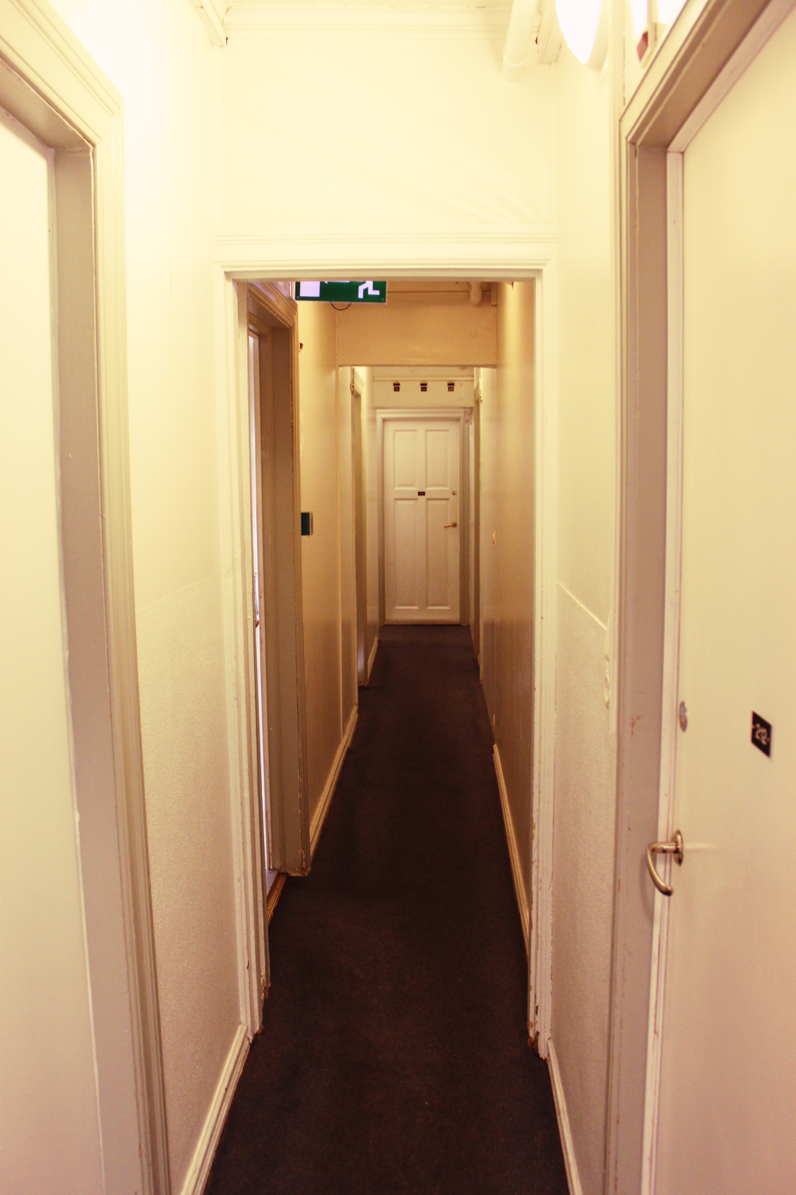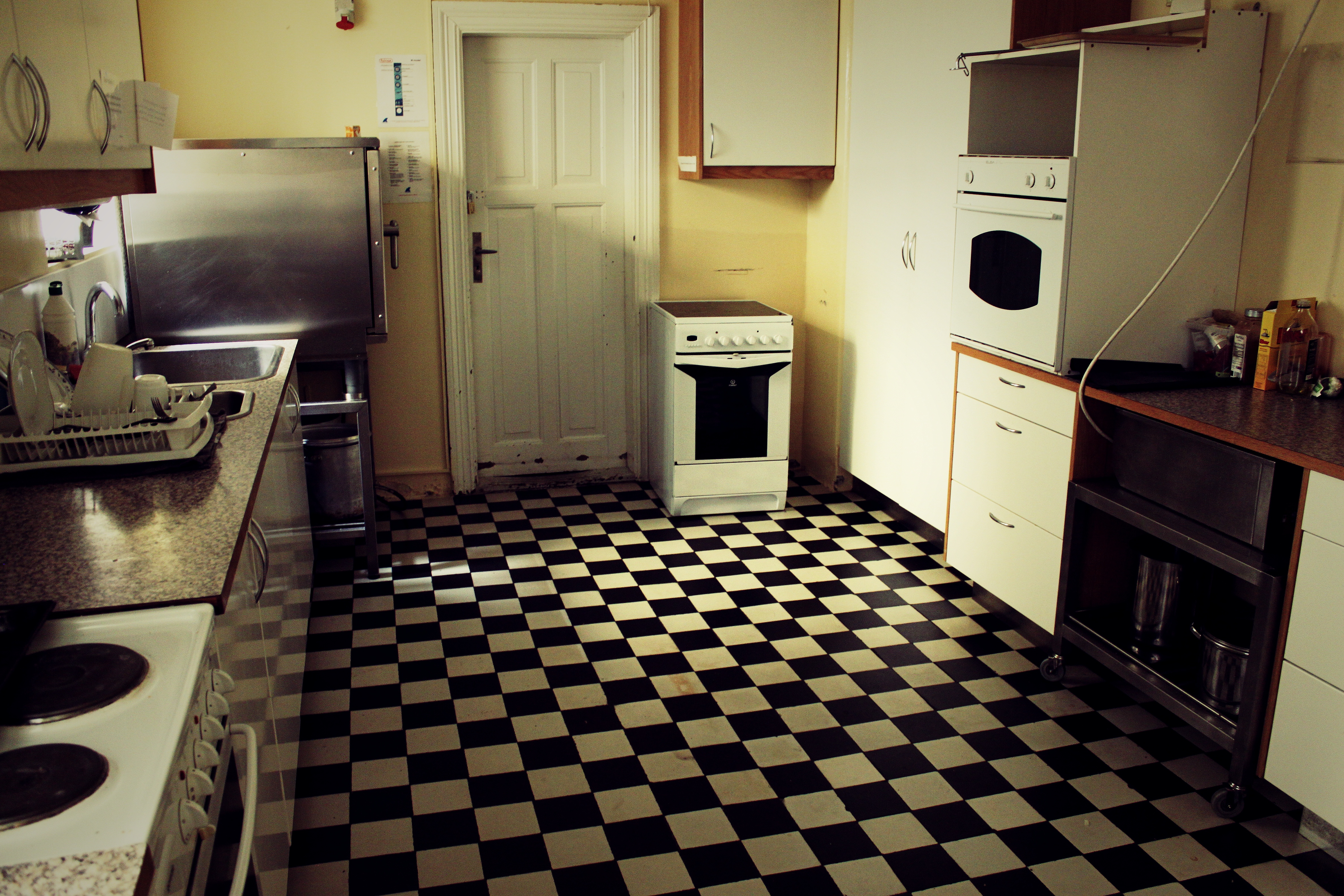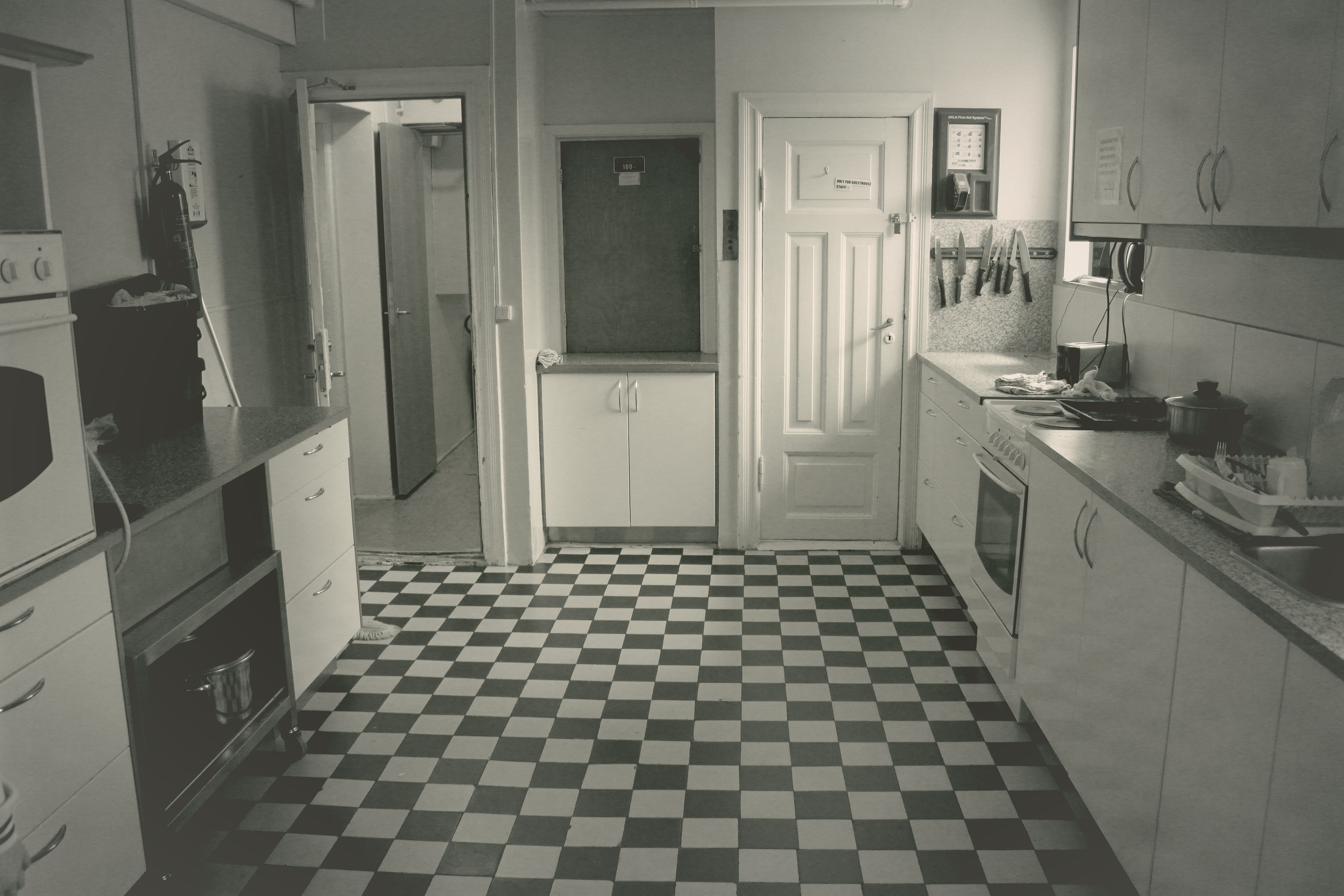 Eldhúsið í kjallaranum. Í húsinu eru fjögur eldhús, þetta sem staðsett er í kjallaranum er stærst, tvö eru á hæðinni fyrir ofan og eitt á þriðju hæð fyrir gesti gistihússins. Hurðirnar og gólfið eru upprunaleg. Þar sem ofninn er var risastór eldavél í gamla daga.