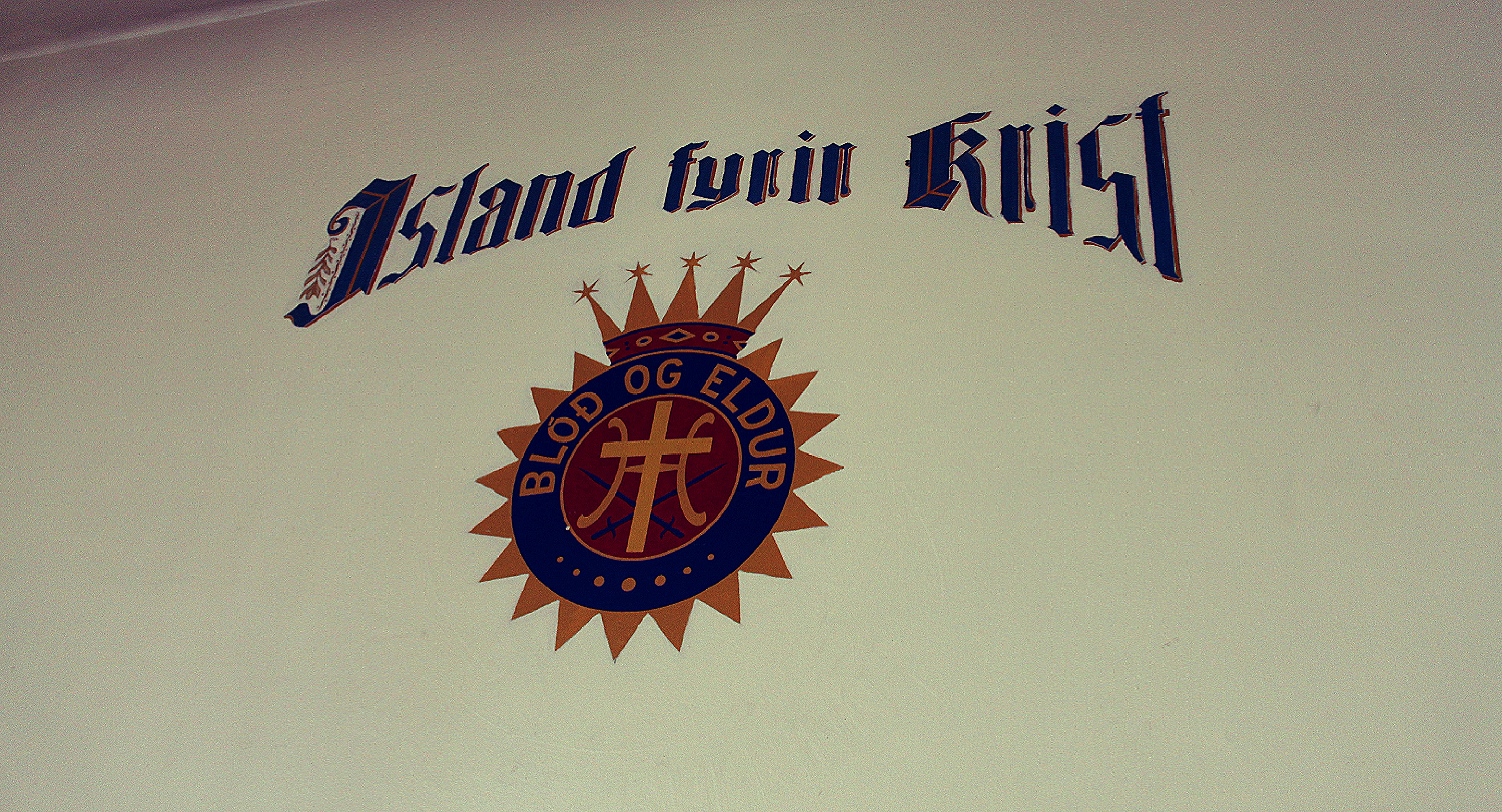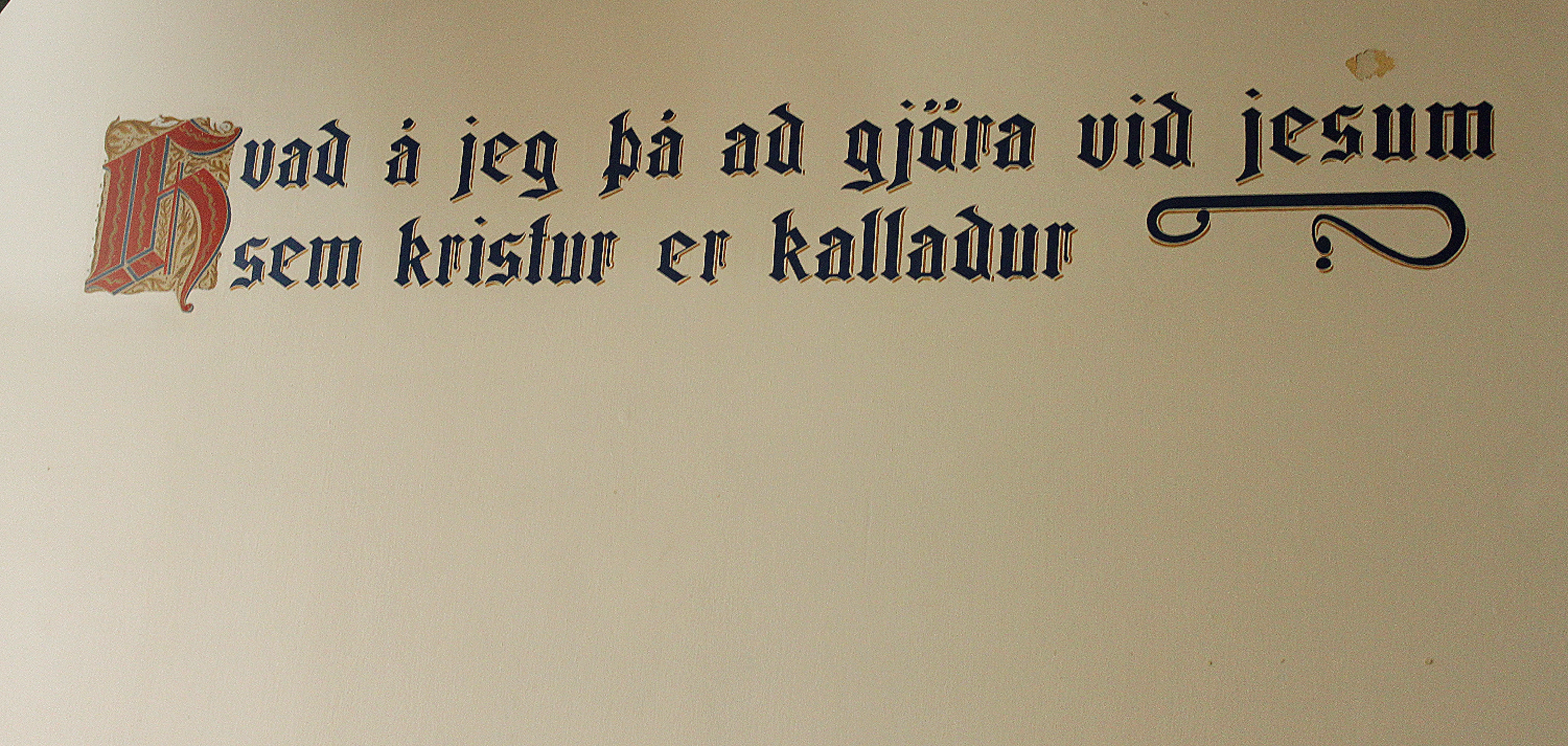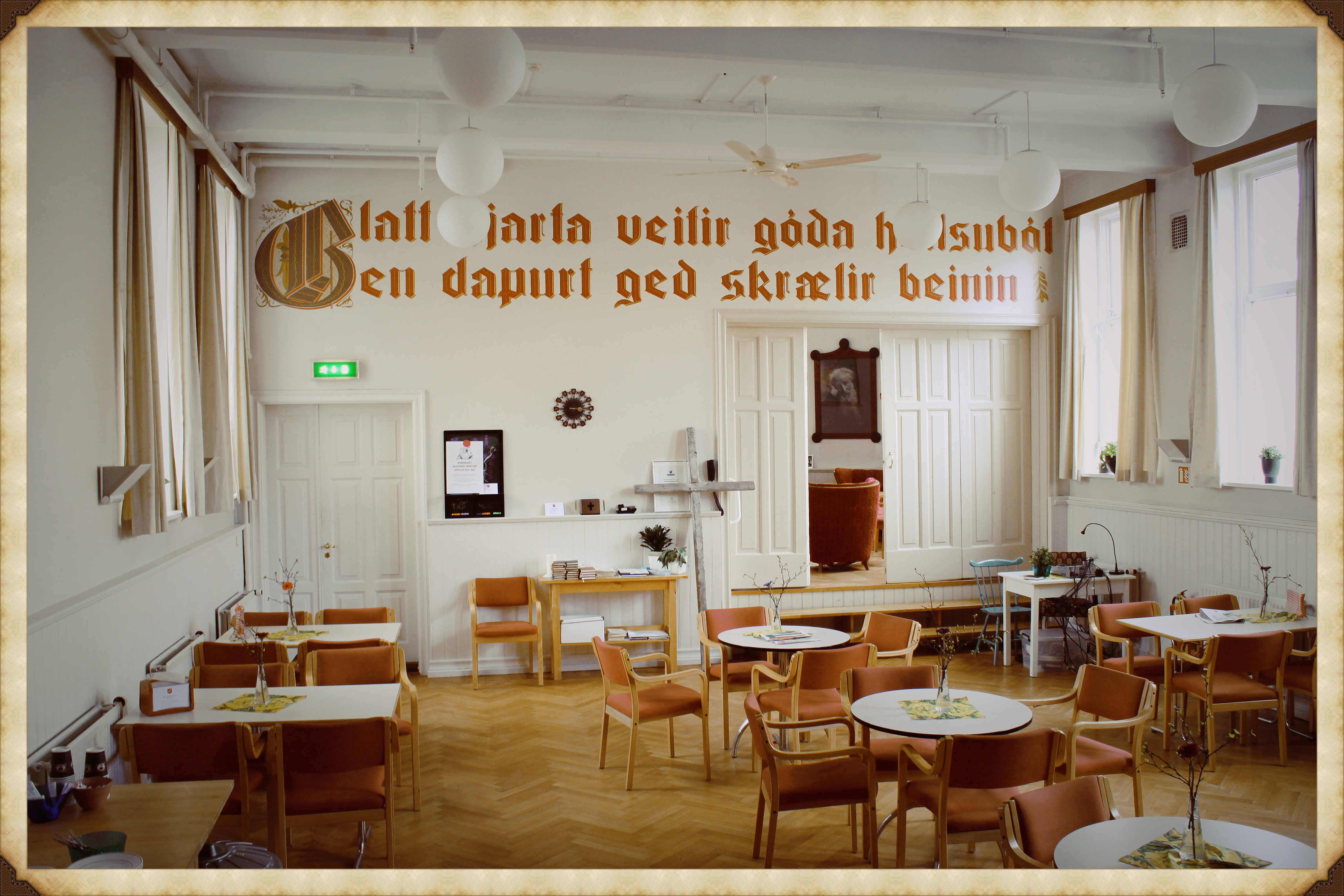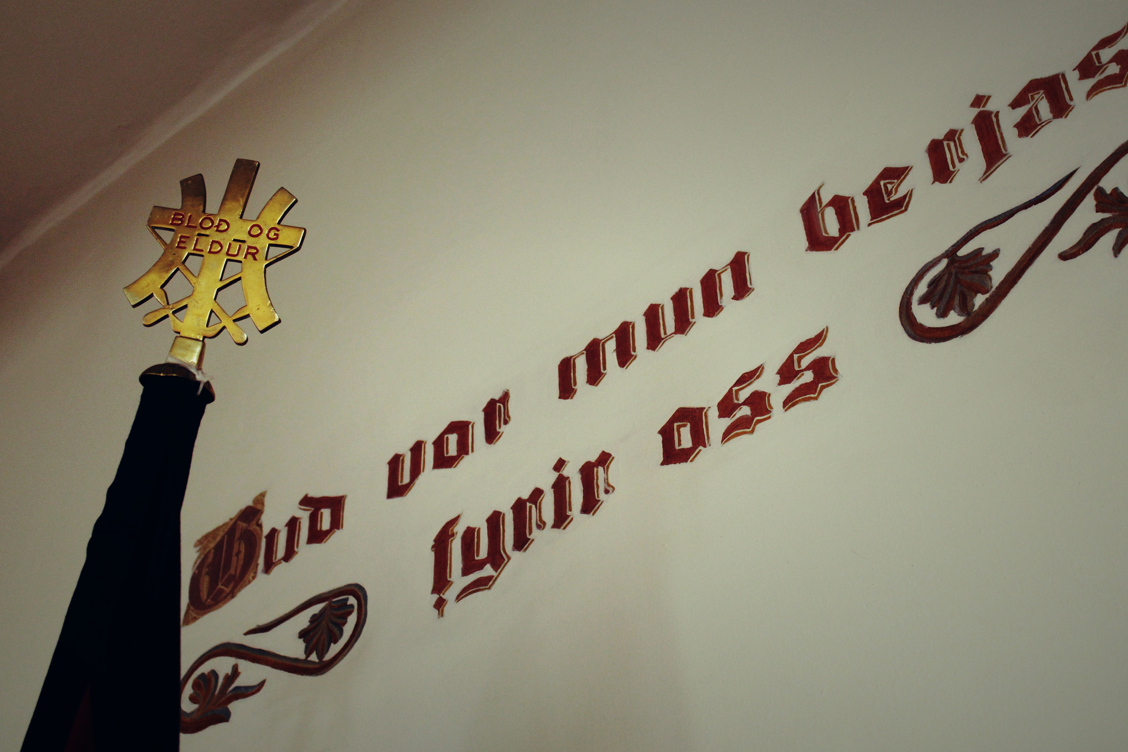 Kirkjan, aðalsalurinn. Tilvitnunin er úr Orðskviðunum og eru allir textanir settir upp fyrir 100 árum síðan.