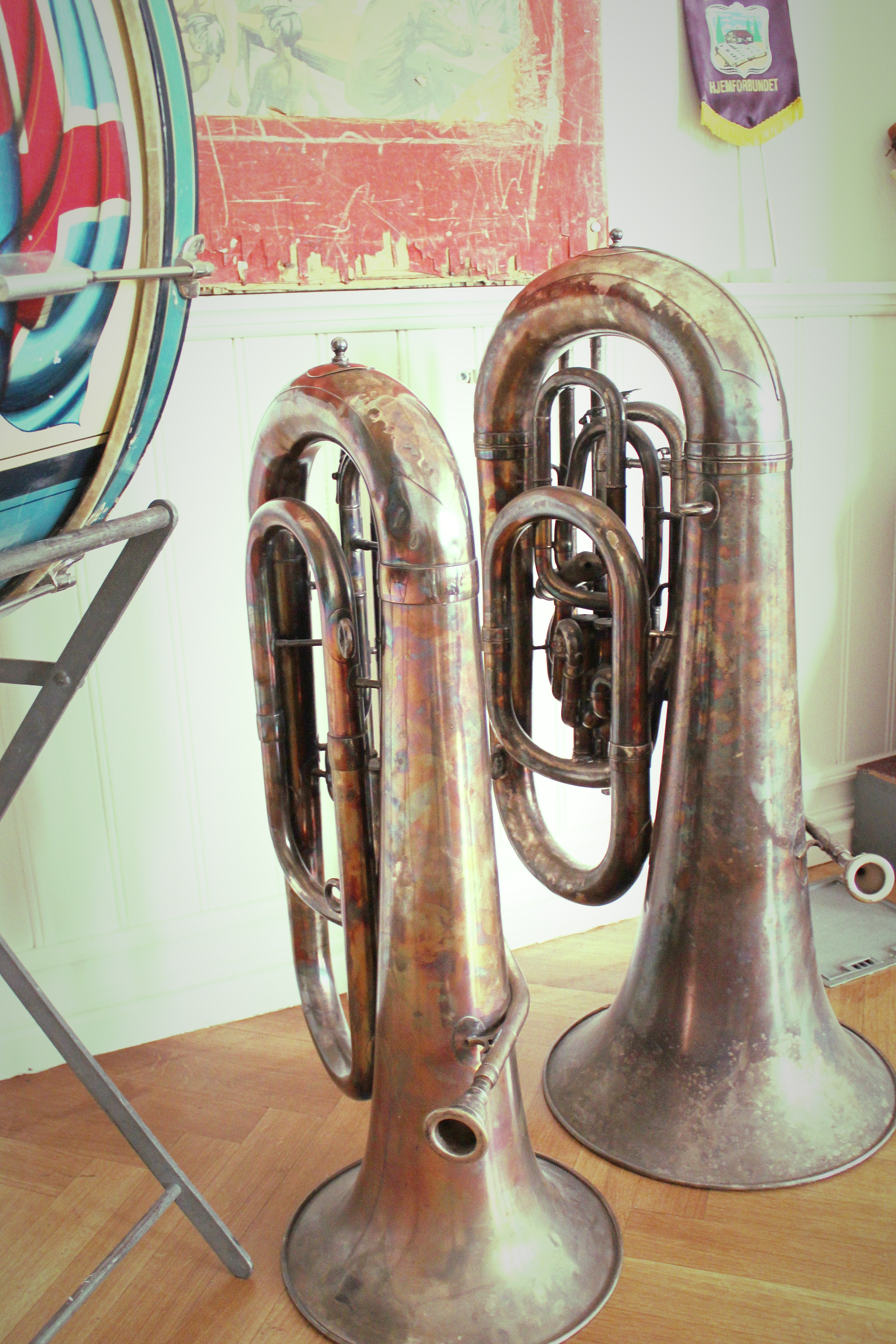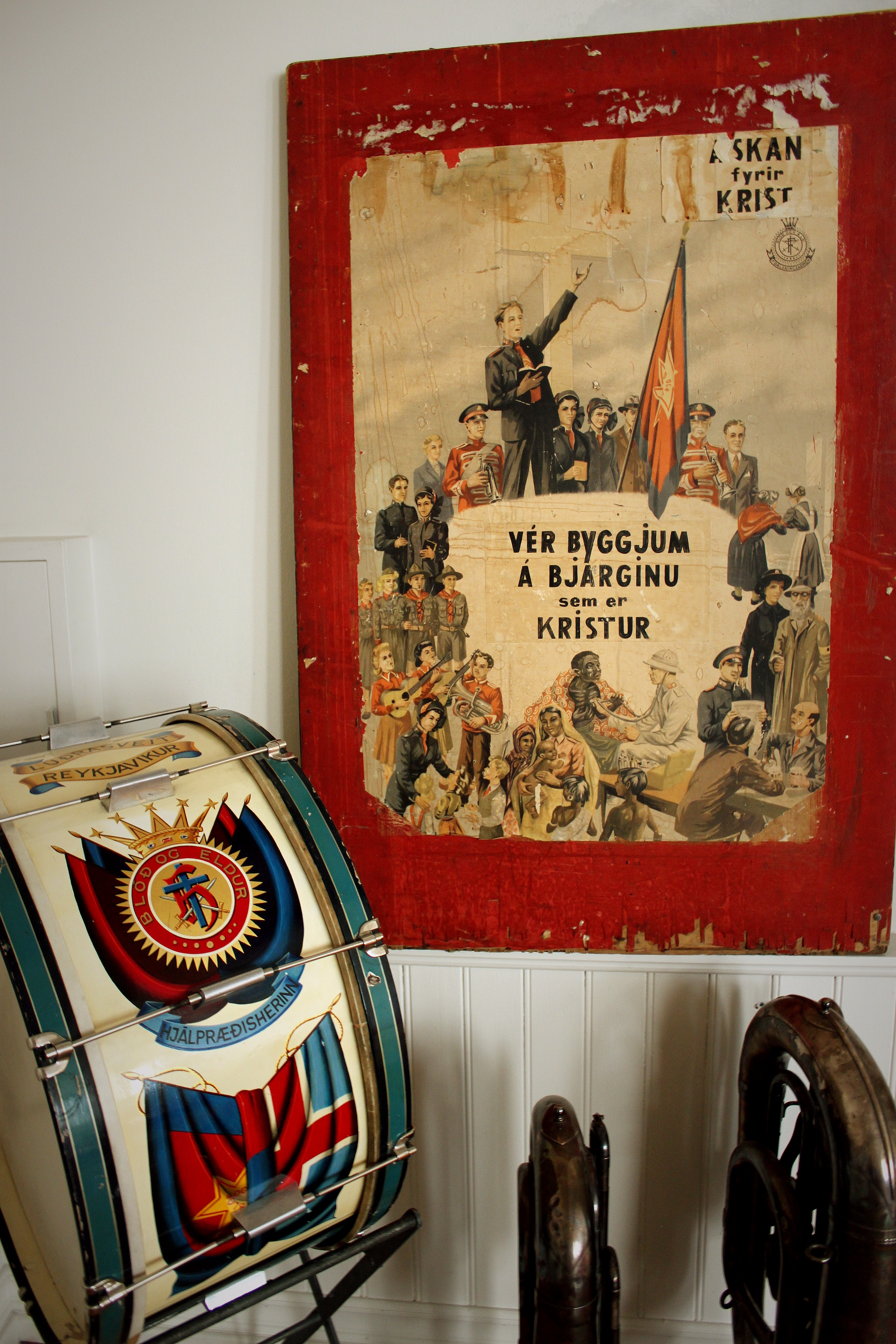 Lúðrarnir á sviðinu eru gjöf frá Færeyjum og bárust þeir Hernum fyrir um ári síðan. Aðspurður segir Ingvi að þeir séu ekki notaðir. „Nei, ekki í dag. Okkur dreymir um að setja upp lúðrasveit en hún hefur ekki verið virk í langan tíma.”