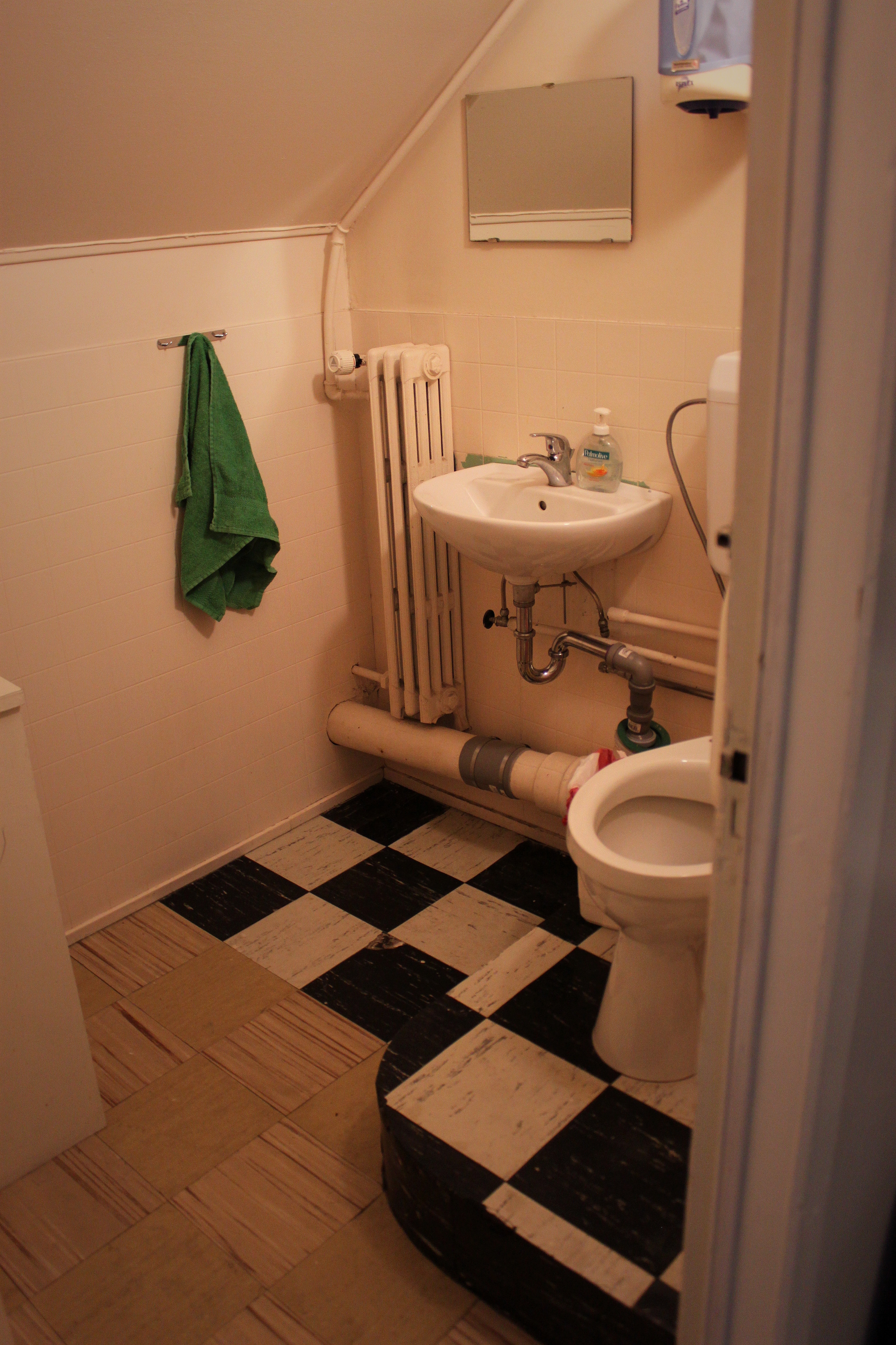 Salerni í kjallaranum. „Já, salernið er einskonar hásæti! Það hefur verið hækkað upp til að ná vatnshallanum.” Sjá má smá „bútasaum” í gólfinu og er salernið og vatnskassinn eflaust eins frá upphafi.