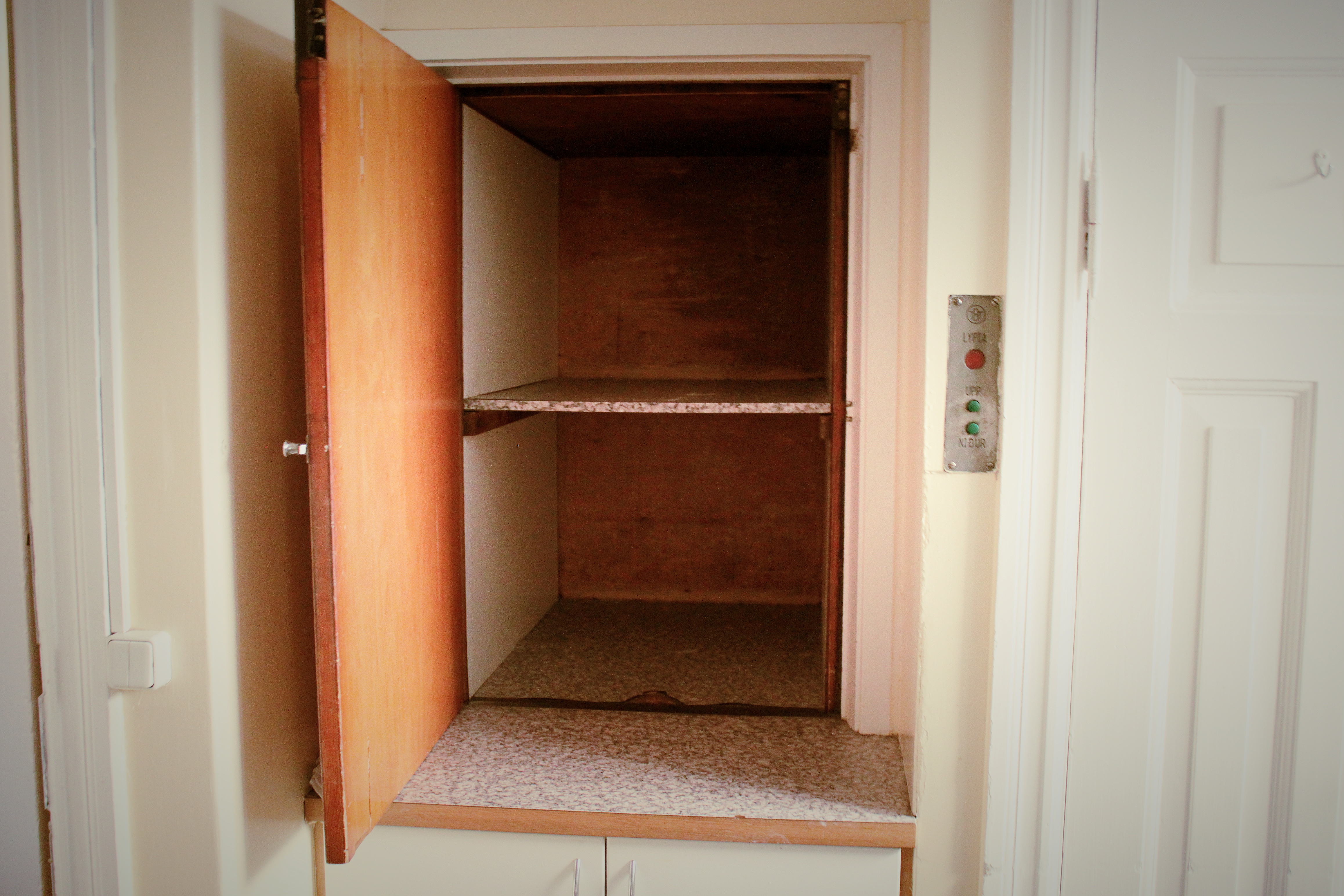 Vörulyftan í eldhúsinu. „Hún virkar enn og er notuð á hverjum degi,” segir Ingvi en fer þó bara upp á aðra hæð.