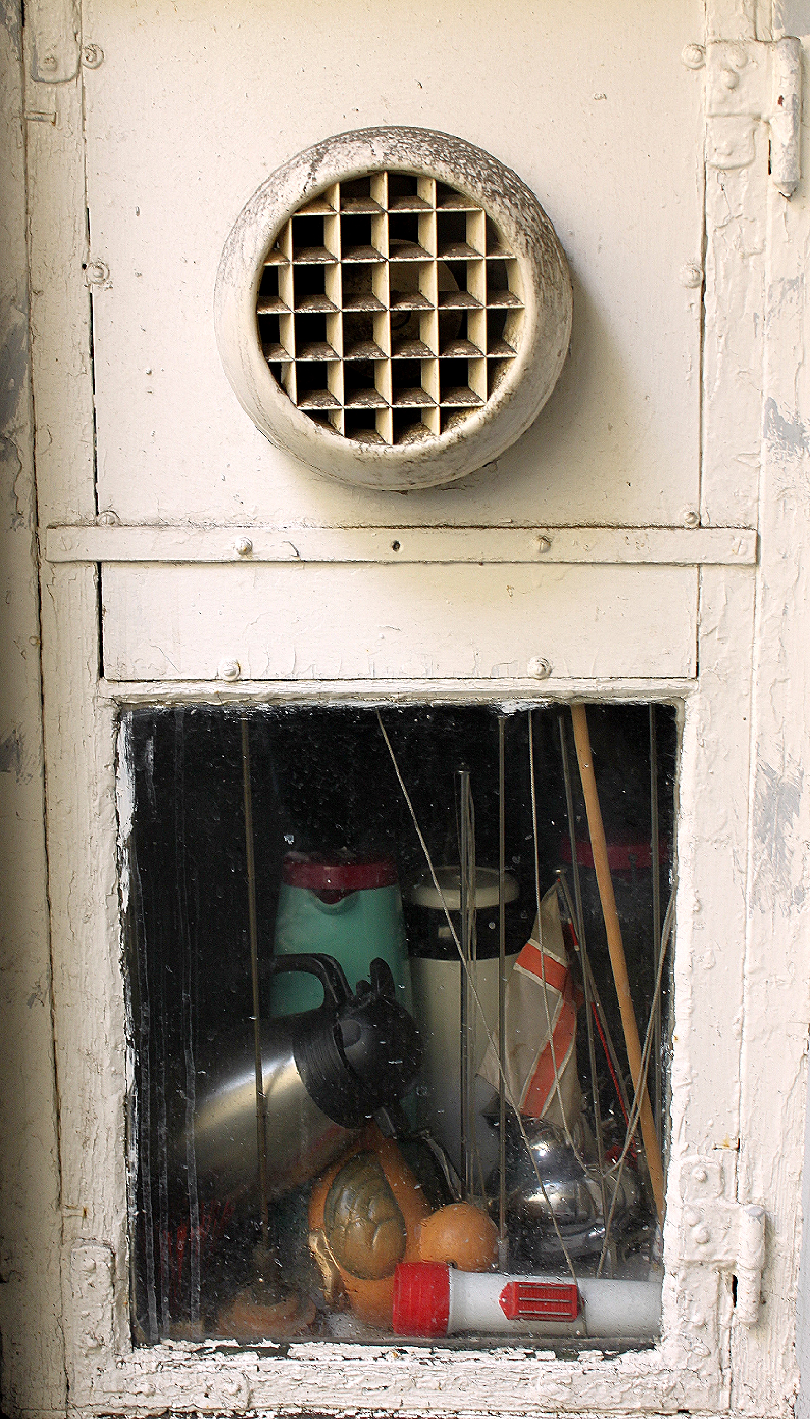 Gluggi inn í búrgeymslu eldhússins í kjallaranum, við hliðina á læstri geymslu við hlið vörulyftunnar.