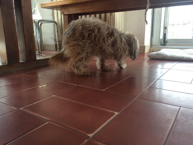Flestir þekkja þessi merki um hræðslu eða óöryggi hjá hundum, þeir beygja sig niður og setja skottið á milli lappanna. Stundum standa þeir kyrrir í smá stund á meðan þeir eru að ákveða hvort þeir eigi að færa sig í burtu eða snúast til varnar (fight or flight response). Á myndinni sést Sunna færa sig undan aðstæðum sem hún var óörugg í, takið eftir að höfuðið er lágt niðri og eyrun lafandi, skottið sömuleiðis í lágri stöðu.