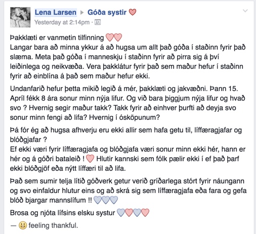 Segir Lena að þau hafi ekki hugmynd um hver gaf lifrina, hvort um fullorðinn eða barn var að ræða, karl eða konu eða hvernig „sá aðili fór.”