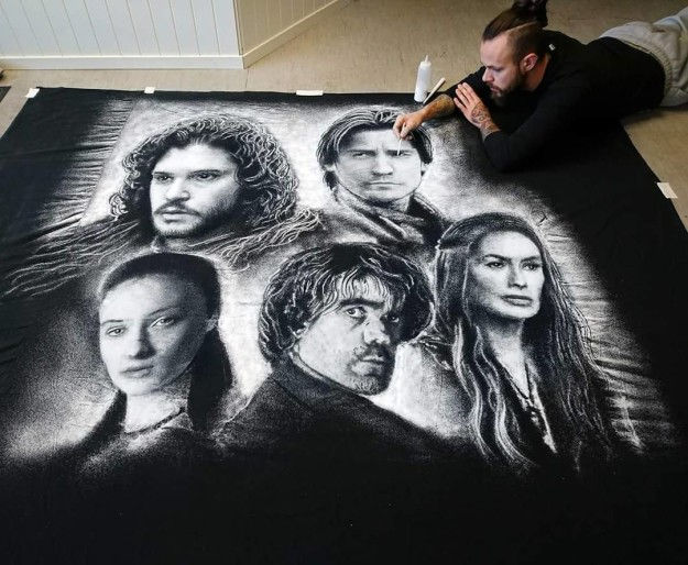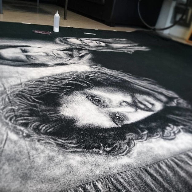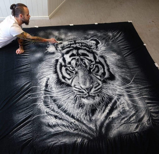 Króatíski listamaðurinn Dino Tomic vinnur oftast nær með hefðbundin efni, s.s. blýant og blað. Hann hinsvegar fann upp aðferð þegar hann meiddist á úlnlið og felst hún í því að nota venjulegt eldhússalt og búa til myndir á svörtum grunni. Eru myndirnar ótrúlega nákvæmar og flottar….og einnig dýrmætar á filmu þar sem ein vindhviða getur hreinlega feykt þeim í burtu!