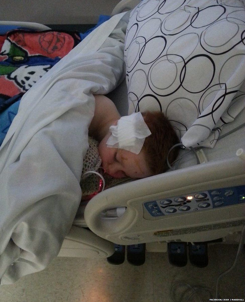 28 ára faðir í Bandaríkjunum hefur rakað af sér hárið og fengið sér húðflúr sem er nákvæmlega eins og örið sem sonur hans fékk eftir að heilaæxli vegna krabbameins var fjarlægt. Josh Marshall sem er frá Kansasríki tók þátt í árlegri keppni sem var haldin af samtökum sem berjast fyrir krabbameini barna og vann um helgina #bestbalddad um helgina. Tvítaði faðirinn stoltur:
