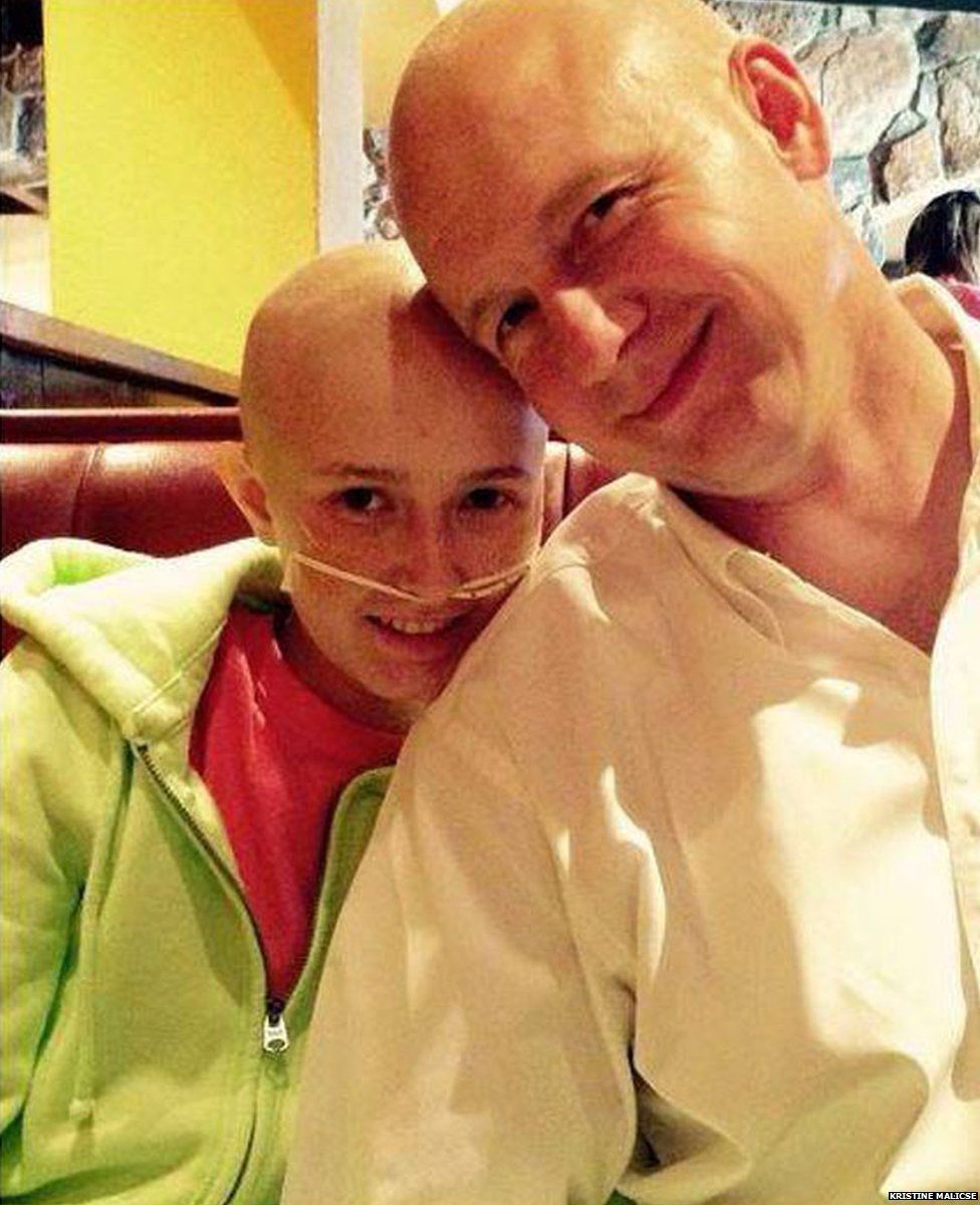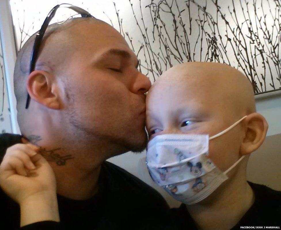 „Ég og sonur minn á viðburðinum St. Baldrick´s í Wichita, Kansas. Fékk mér húðflúr nákvæmlega eins og skurðsár hans vegna heilaæxlis sem var fjarlægt. Hann varð afar óöruggur vegna lýtanna og vildi ég því styðja hann,“ segir Josh.