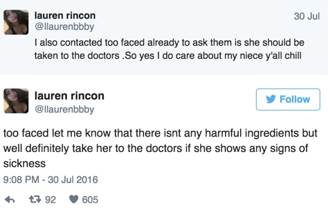 Þessi mynd af barninu… Færslu Lauren Rincon hefur verið „retweetað“ um 50 þúsund sinnum eftir að hún birti mynd af eins árs frænku sinni eftir að hún át augnskugga úr augnskuggapallettu. Lauren sem er átján ára kom heim um leið og móðir hennar hafði uppgötvað að Kaitlyn (1 árs) hafði laumast inn í herbergið hennar og borðað augnskuggana.