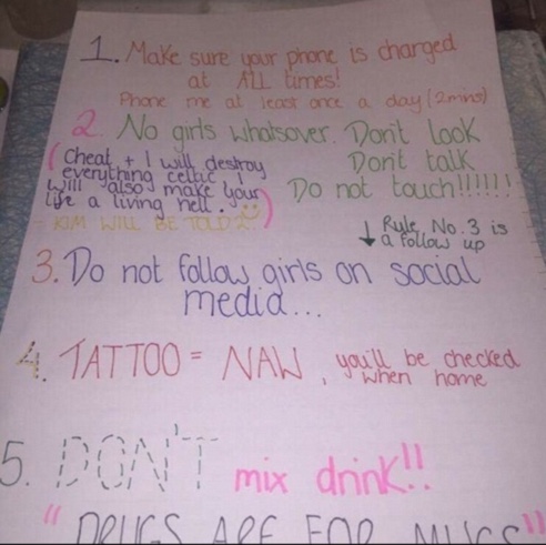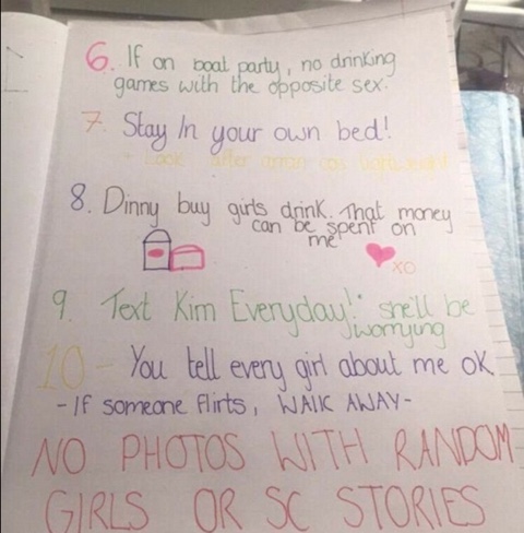 Sitt sýnist hverjum um samskipti þessa pars, en kærastan Whitney Travers frá Edinborg, Skotlandi, bjó til afar ítarlega bók fyrir kærastann áður en hann fór til Magaluf á Spáni í sólarlandaferð. Kieran Lumsden tvítaði svo færslunni og sagði Whitney hafa „tekið geðveikina sína upp á næsta stig.“ Hefur færslunni verið deilt mörg þúsund sinnum og fólk annaðhvort hrósað henni fyrir hreinskilnina eða vorkennt honum.