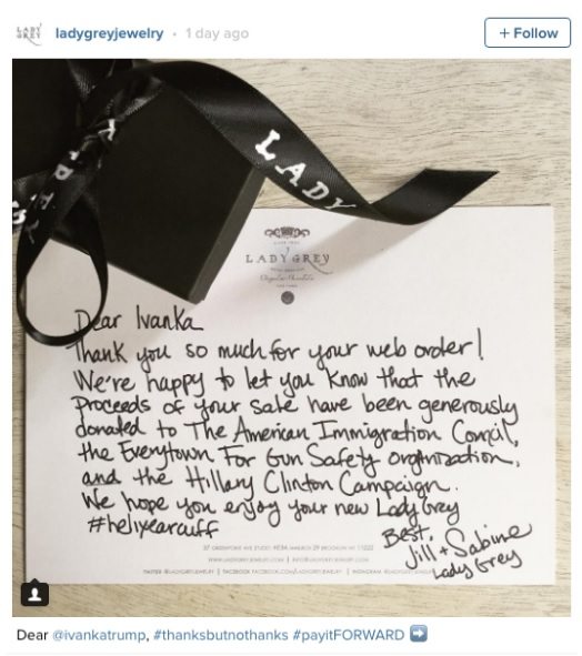 Donald Trump hefur ábyggilega orðið brjálaður að frétta af þessu: Dóttir hans, Ivanka, pantaði fullt af skartgripum frá Lady Grey skartgripaframleiðandanum. Jill Martinelli og Sabine Le Guyader, hönnuðir skartgripanna, voru glaðar að afgreiða pöntunina, en ekki jafn ánægðar að þiggja peningana hennar. Í staðinn tóku þær hagnaðinn af pöntuninni og gáfu til framboðs Hillary Clilnton, Innflytjendaráðs Bandaríkjanna og Gun Safety Organization, (samtök sem berjast fyrir takmarkaðri byssueign).