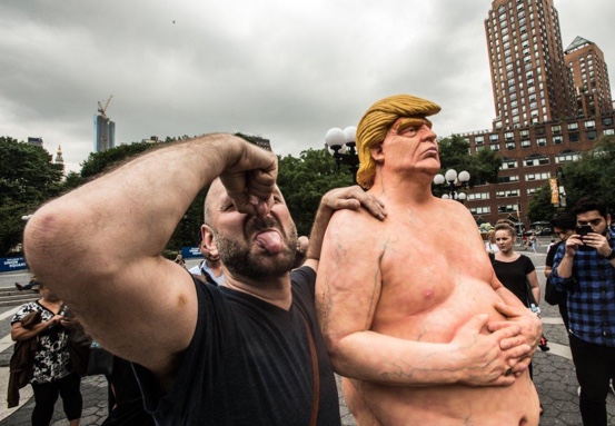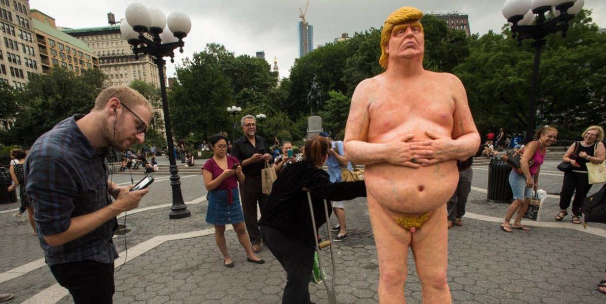„Keisarinn hefur engar hreðjar,“ stóð fyrir neðan styttu sem skyndilega var sett upp á Union Square í Manhattan í New York. Var styttan afar raunveruleg eftirmynd forsetaframbjóðandans – yfirgreiðslan á hárinu og risastór bumba….svo ekki sé minnst á pínulítil kynfæri. „Besta sem ég hef séð!“ sagði hlæjandi gangandi vegfarandi, Josephie Espinal: „Þetta er sögulegt meistarastykki.“
