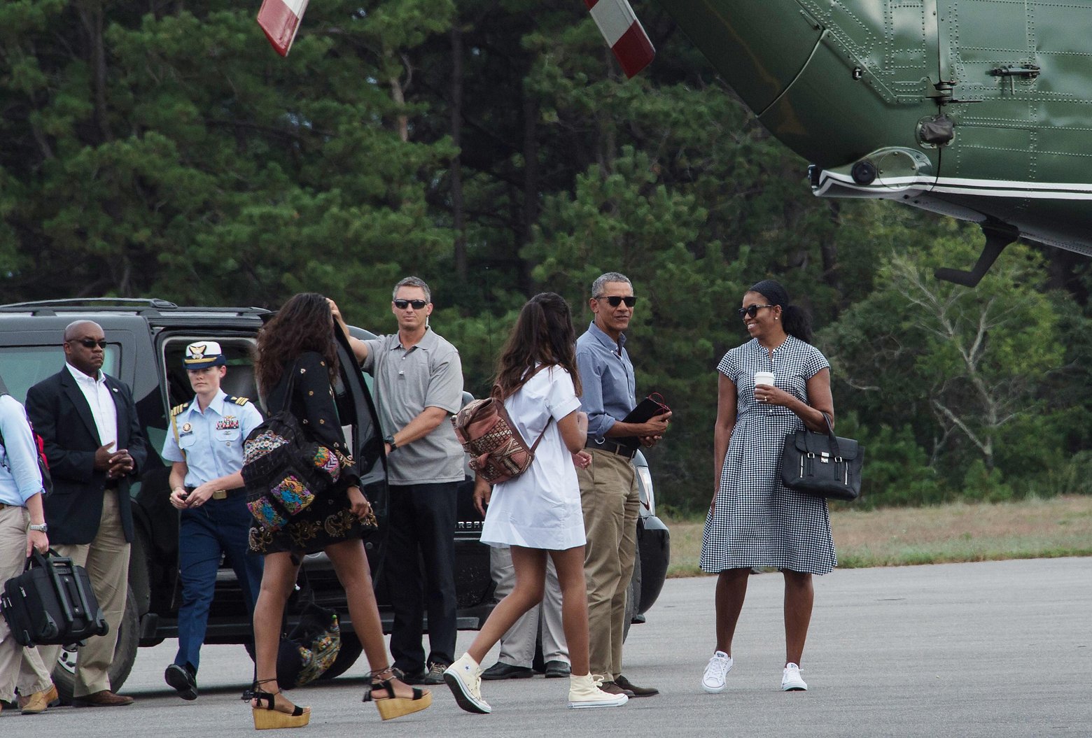 Meira að segja forsetafrú Bandaríkjanna elskar að vera í strigaskóm við kjól! Fjölskyldan er nýkomin frá Martha’s Vineyard, Massachusetts, í gær eftir 16 daga vel heppnað frí.