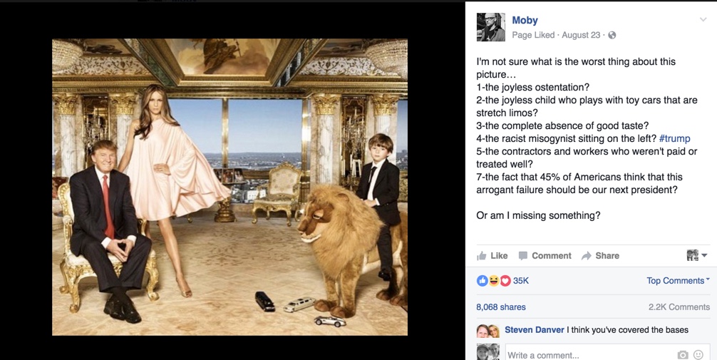 Tónlistarmaðurinn góðkunni, Moby, vandar Donald Trump ekki kveðjurnar í nýlegum pósti á Facebook. Birtir hann mynd af uppstilltri mynd af fjölskyldunni og veltir upp ýmsum áhugaverðum spurningum.