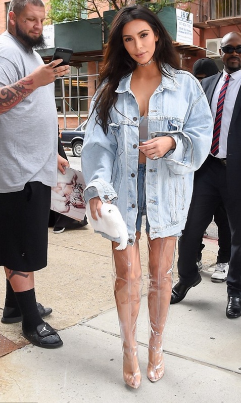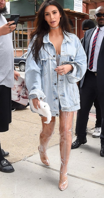 Þegar Kim Kardashian, sem er 35 ára, skartaði óvenjulegum skóbúnaði var athygli gulu pressunnar vakin. Litu hælarnir ekki út fyrir að vera þægilegir en þeir voru upp á mið læri og já…gegnsæir!