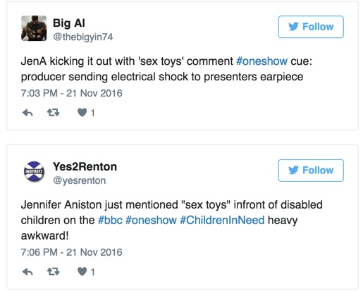 Kom hún fram ásamt leikstjórum myndarinnar, Will Speck og Josh Gordon sem voru að spjalla saman en þau deildu stúdíóinu með fötluðum börnum sem voru að vekja ahygli á málefnum barna í samtökunum Children in Need. Spyrlar BBC þau Alex Jones og Matt Baker voru að spyrja Jennifer um persónu hennar í Office Christmas Party og eftir að hafa borið persónuna saman við persónu Rachel úr Friends og Horrible Bosses sagði Josh að hún væri svona „smá af báðum.“ Þá kom þessi setning frá Jennifer: „Bara án kynlífsleikfanganna.“