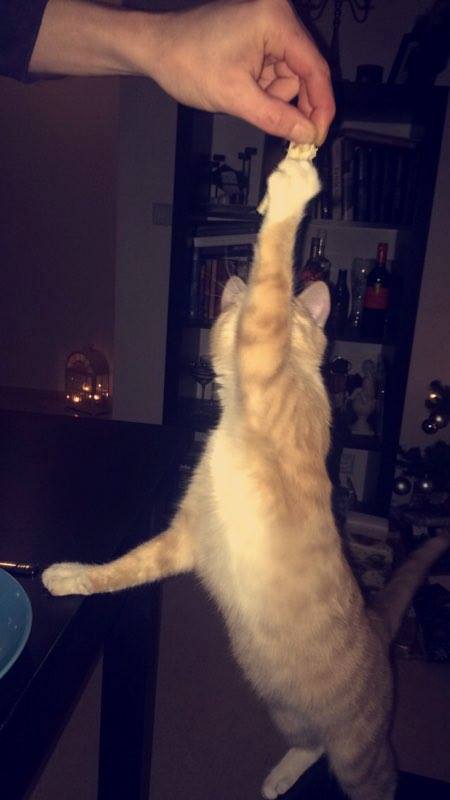 U: Jájá, nú gef ég honum bara allskonar að éta, hann vill náttúrulega alltaf það sem ég er að borða en ég er að reyna að vera harður og láta hann bara skilja að það sé ekki í boði… en ef eitthvað dettur í gólfið eða svoleiðis þá getur maður ekki annað en leyft honum að fá, fæ stundum afganga úr vinnunni líka.
