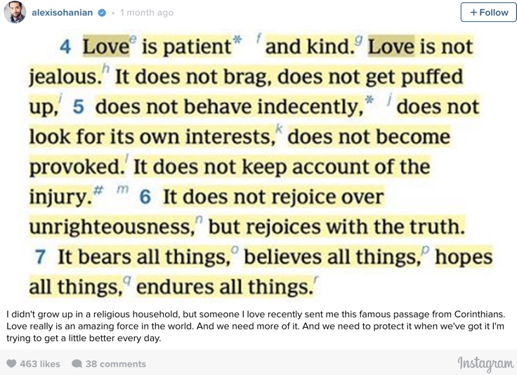 Fyrir sex vikum setti Alexis línur úr Bibíunni á Instagramsíðuna sína um kærleikinn: