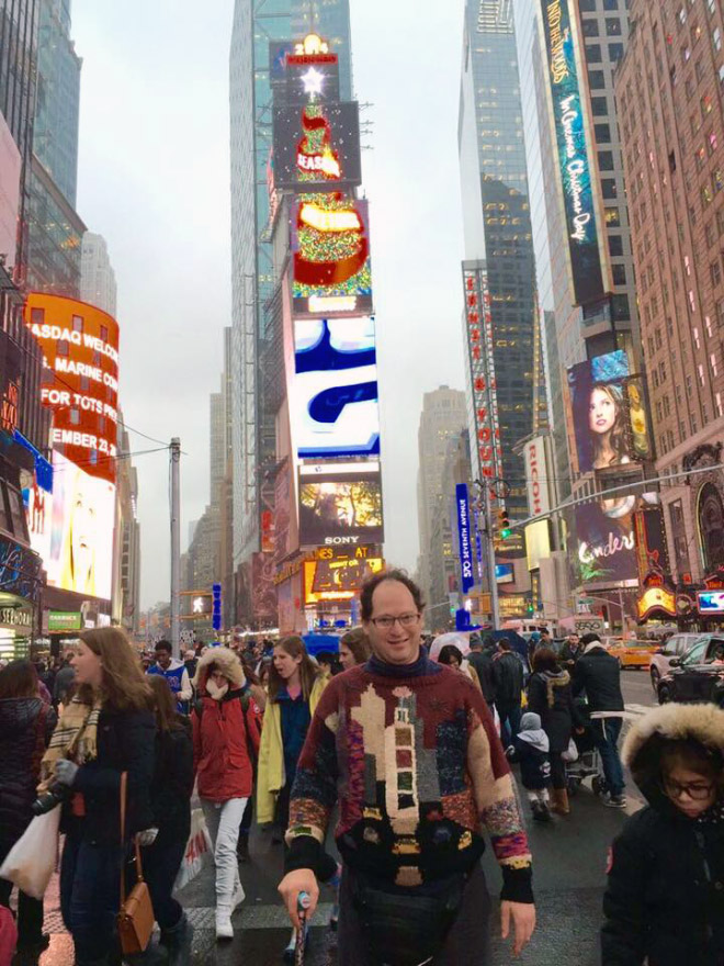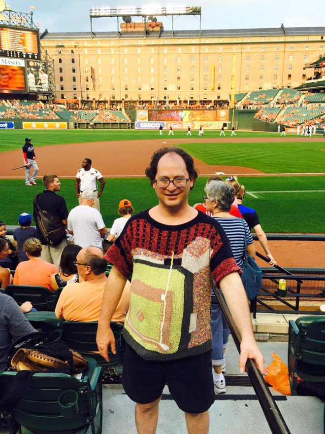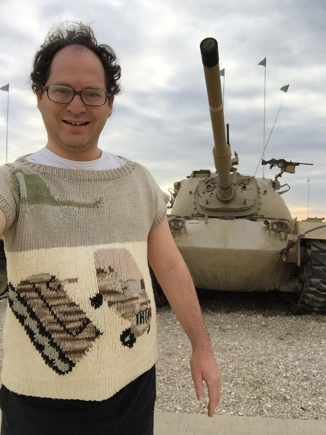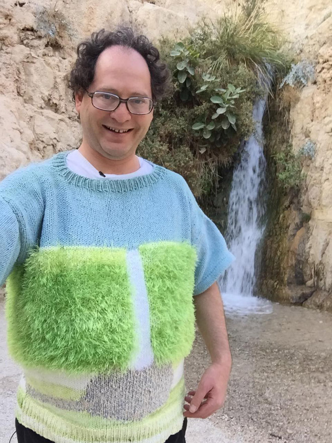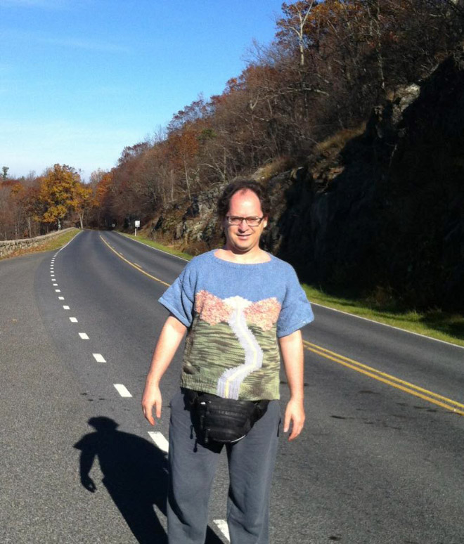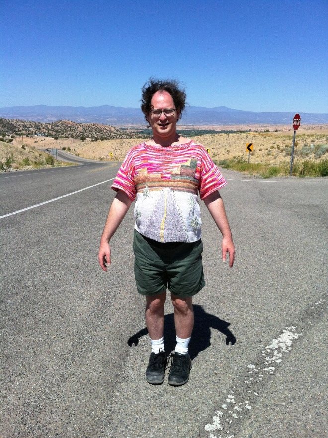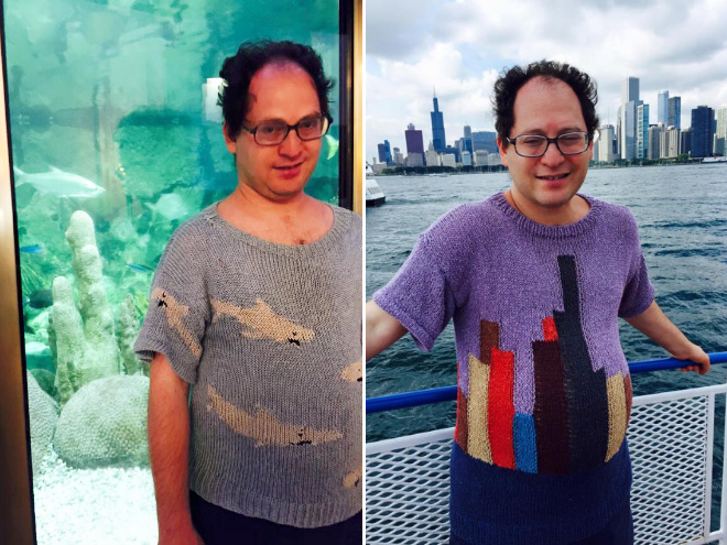 Þessi er sniðugur! Áhugamál Sam Barsky eru sennilega að ferðast og að prjóna…og sameinar hann þau áhugamál á Facebooksíðu sinni sem þér ætti að líka við. Hér eru nokkrar af peysunum hans og frummyndunum: