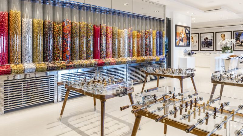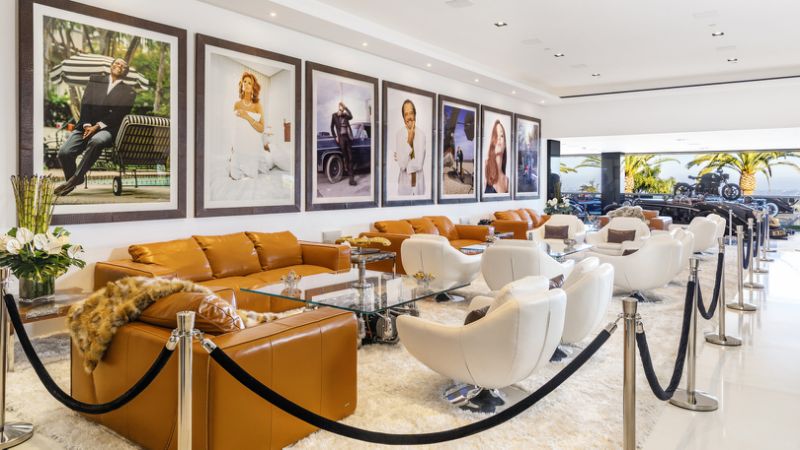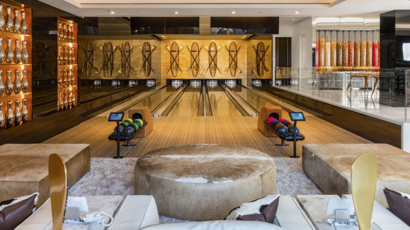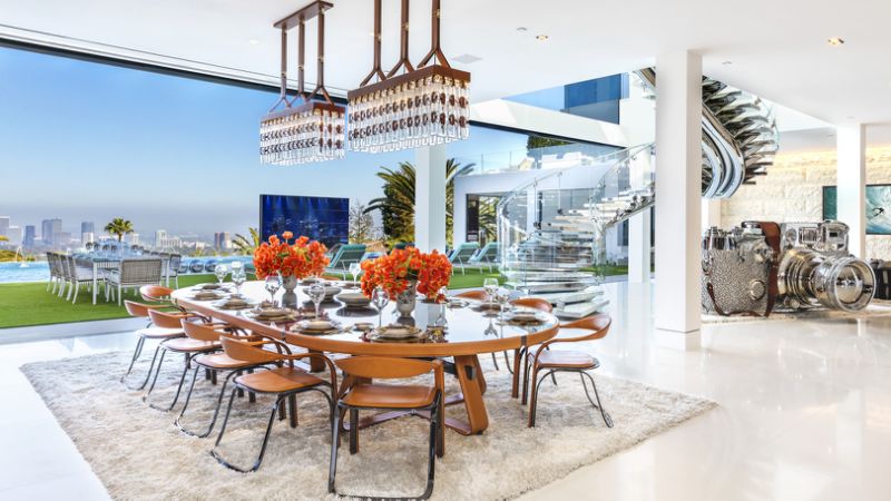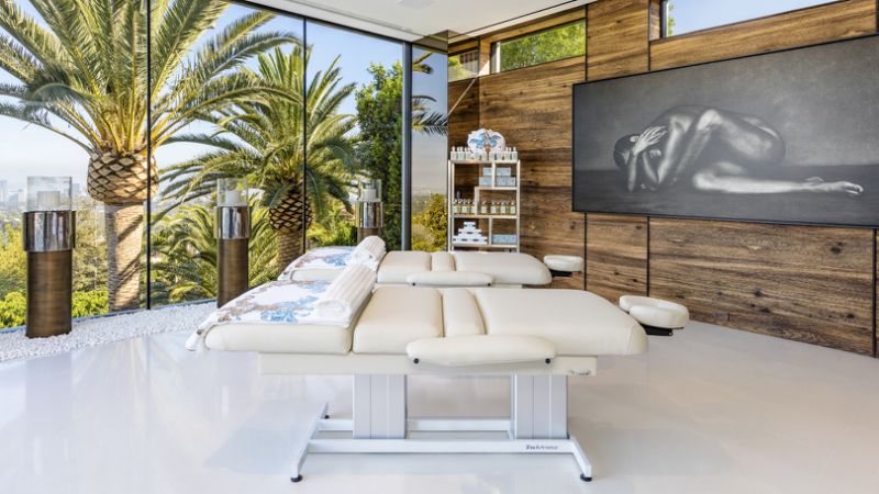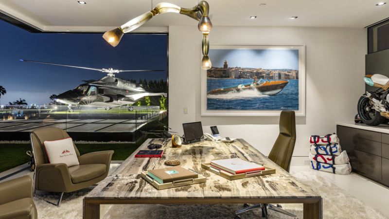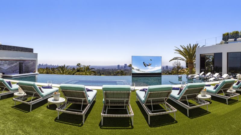 12 svefnhverbergi, 21 baðherbergi, sjö manneskjur til að sjá um húsið, þrjú eldhús, fimm barir, heilsulind, líkamsrækt og bíósalur í James Bond þema, 40 sæta. Þessi ótrúlega höll kostar 250 milljón dala og er staðsett í Bel Air í Los Angeles.